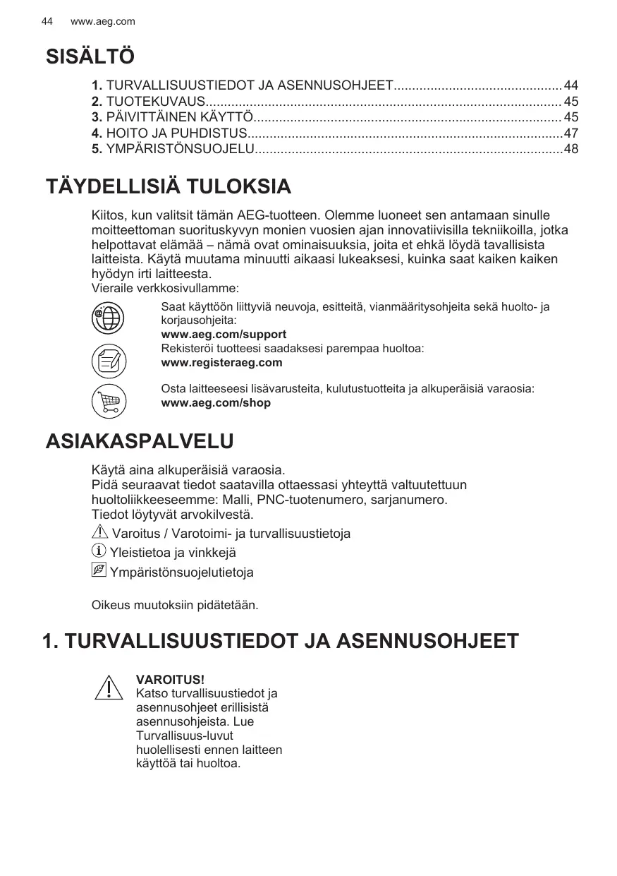 Enregistrer votre produit pour un meilleur service : www.registeraeg.com Acheter des accessoires, consommables et pièces de rechange d’origine pour votre appareil : www.aeg.com/shop
