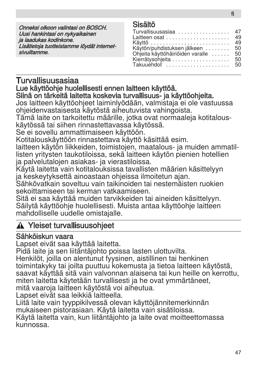 , Yleiset turvallisuusohjeet Sähköiskun vaara Lapset eivät saa käyttää laitetta. Pidä laite ja sen liitäntäjohto poissa lasten ulottuvilta. Henkilöt, joilla on alentunut fyysinen, aistillinen tai henkinen toimintakyky tai joilta puuttuu kokemusta ja tietoa laitteen käytöstä, saavat käyttää sitä vain valvonnan alaisena tai kun heille on kerrottu, miten laitetta käytetään turvallisesti ja he ovat ymmärtäneet, mitä vaaroja laitteen käytöstä voi aiheutua. Lapset eivät saa leikkiä laitteella. Liitä laite vain tyyppikilvessä olevan käyttöjännitemerkinnän mukaiseen pistorasiaan. Käytä laitetta vain sisätiloissa. Käytä laitetta vain, kun liitäntäjohto ja laite ovat moitteettomassa kunnossa. Robert Bosch Hausgeräte GmbH