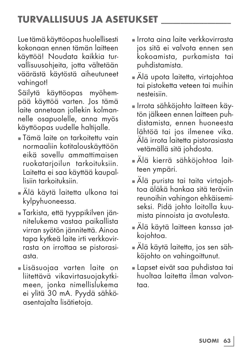 TURVALLISUUS JA ASETUKSET_ __________________ Lue tämä käyttöopas huolellisesti kokonaan ennen tämän laitteen käyttöä! Noudata kaikkia turvallisuusohjeita, jotta vältetään väärästä käytöstä aiheutuneet vahingot! Säilytä käyttöopas myöhempää käyttöä varten. Jos tämä laite annetaan jollekin kolmannelle osapuolelle, anna myös käyttöopas uudelle haltijalle. Tämä laite on tarkoitettu vain normaaliin kotitalouskäyttöön eikä sovellu ammattimaisen ruokatarjoilun tarkoituksiin. Laitetta ei saa käyttää kaupallisiin tarkoituksiin. Älä käytä laitetta ulkona tai kylpyhuoneessa. Tarkista, että tyyppikilven jännitelukema vastaa paikallista virran syötön jännitettä. Ainoa tapa kytkeä laite irti verkkovirrasta on irrottaa se pistorasiasta. Lisäsuojaa varten laite on liitettävä vikavirtasuojakytkimeen, jonka nimellislukema ei ylitä 30 mA. Pyydä sähköasentajalta lisätietoja.
