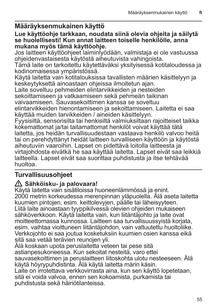 WW Risque de chocs électriques et d’incendie N’utiliser l’appareil que dans des pièces intérieures à température ambiante et jusqu’à 2000 m d’altitude. Ne pas poser l’appareil sur des surfaces chaudes (tables de cuisson par ex.) ou à proximité de celles-ci. Brancher et utiliser l’appareil uniquement en conformité avec les indications figurant sur la plaque signalétique. N’utiliser l’appareil que si son cordon d’alimentation et l’appareil lui-même ne présentent aucun dommage. Afin d’écarter tout danger, seul notre service après-vente est habilité à réparer l’appareil, comme par exemple, procéder au remplacement d’un cordon d’alimentation endommagé. Ne pas mettre le cordon d’alimentation en contact avec des éléments brûlants et ne pas le faire glisser sur des arêtes vives. Ne jamais plonger l’appareil de base dans l’eau, ni le mettre au lavevaisselle. Ne pas plonger l’appareil dans un liquide au-delà de la jonction entre l’appareil de base et l’accessoire mixeur rapide. Ne pas utiliser de nettoyeur à vapeur. 16