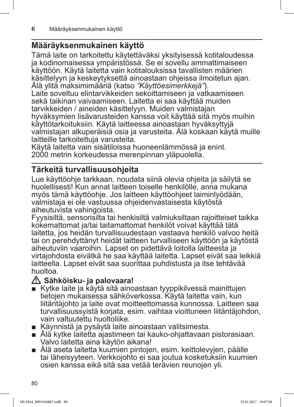 Tämä laite on tarkoitettu Käytettäväksi yksityisessä kotitaloudessa ja kodinomaisessa ympäristôssä. Se ei sovellu ammattimaiseen käyttéôn. Käytä laitetta vain kotitalouksissa tavallisten määrien käsittelyyn ja keskeytyksettä ainoastaan ohjeissa ilmoitetun ajan. Âlà ylità maksimimääriä (katso “Käyttéesimerkkejä”).