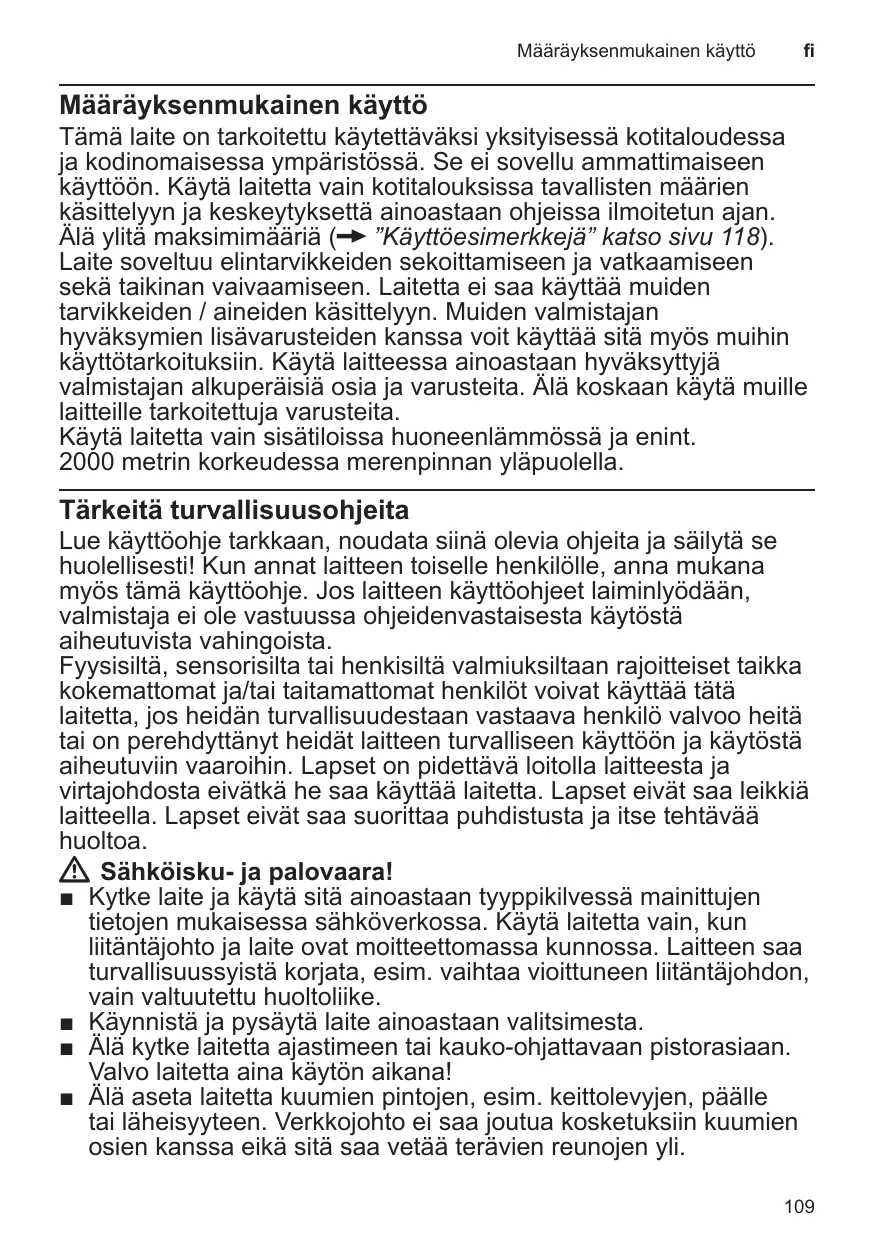 Tämä laite on tarkoitettu käytettäväksi yksityisessä kotitaloudessa ja kodinomaisessa ympäristössä. Se ei sovellu ammattimaiseen käyttöön. Käytä laitetta vain kotitalouksissa tavallisten määrien käsittelyyn ja keskeytyksettä ainoastaan ohjeissa ilmoitetun ajan. Älä ylitä maksimimääriä (X ”Käyttöesimerkkejä” katso sivu 118). Laite soveltuu elintarvikkeiden sekoittamiseen ja vatkaamiseen sekä taikinan vaivaamiseen. Laitetta ei saa käyttää muiden tarvikkeiden / aineiden käsittelyyn. Muiden valmistajan hyväksymien lisävarusteiden kanssa voit käyttää sitä myös muihin käyttötarkoituksiin. Käytä laitteessa ainoastaan hyväksyttyjä valmistajan alkuperäisiä osia ja varusteita. Älä koskaan käytä muille laitteille tarkoitettuja varusteita. Käytä laitetta vain sisätiloissa huoneenlämmössä ja enint. 2000 metrin korkeudessa merenpinnan yläpuolella.