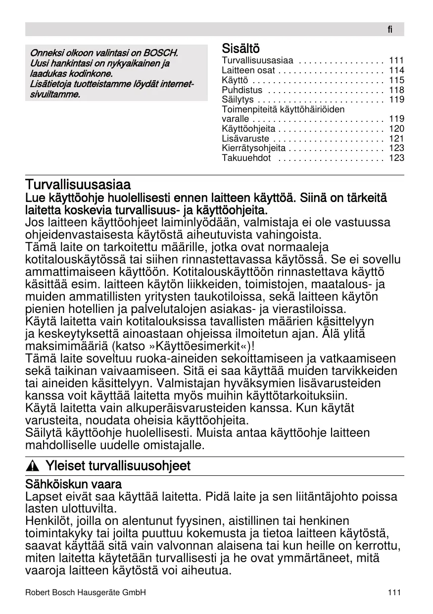 Turvallisuusasiaa Lue käyttöohje huolellisesti ennen laitteen käyttöä. Siinä on tärkeitä laitetta koskevia turvallisuus- ja käyttöohjeita. Jos laitteen käyttöohjeet laiminlyödään, valmistaja ei ole vastuussa ohjeidenvastaisesta käytöstä aiheutuvista vahingoista. Tämä laite on tarkoitettu määrille, jotka ovat normaaleja kotitalouskäytössä tai siihen rinnastettavassa käytössä. Se ei sovellu ammattimaiseen käyttöön. Kotitalouskäyttöön rinnastettava käyttö käsittää esim. laitteen käytön liikkeiden, toimistojen, maatalous- ja muiden ammatillisten yritysten taukotiloissa, sekä laitteen käytön pienien hotellien ja palvelutalojen asiakas- ja vierastiloissa. Käytä laitetta vain kotitalouksissa tavallisten määrien käsittelyyn ja keskeytyksettä ainoastaan ohjeissa ilmoitetun ajan. Älä ylitä maksimimääriä (katso »Käyttöesimerkit«)! Tämä laite soveltuu ruoka-aineiden sekoittamiseen ja vatkaamiseen sekä taikinan vaivaamiseen. Sitä ei saa käyttää muiden tarvikkeiden tai aineiden käsittelyyn. Valmistajan hyväksymien lisävarusteiden kanssa voit käyttää laitetta myös muihin käyttötarkoituksiin. Käytä laitetta vain alkuperäisvarusteiden kanssa. Kun käytät varusteita, noudata oheisia käyttöohjeita. Säilytä käyttöohje huolellisesti. Muista antaa käyttöohje laitteen mahdolliselle uudelle omistajalle. , Yleiset turvallisuusohjeet Sähköiskun vaara Lapset eivät saa käyttää laitetta. Pidä laite ja sen liitäntäjohto poissa lasten ulottuvilta. Henkilöt, joilla on alentunut fyysinen, aistillinen tai henkinen toimintakyky tai joilta puuttuu kokemusta ja tietoa laitteen käytöstä, saavat käyttää sitä vain valvonnan alaisena tai kun heille on kerrottu, miten laitetta käytetään turvallisesti ja he ovat ymmärtäneet, mitä vaaroja laitteen käytöstä voi aiheutua. Robert Bosch Hausgeräte GmbH