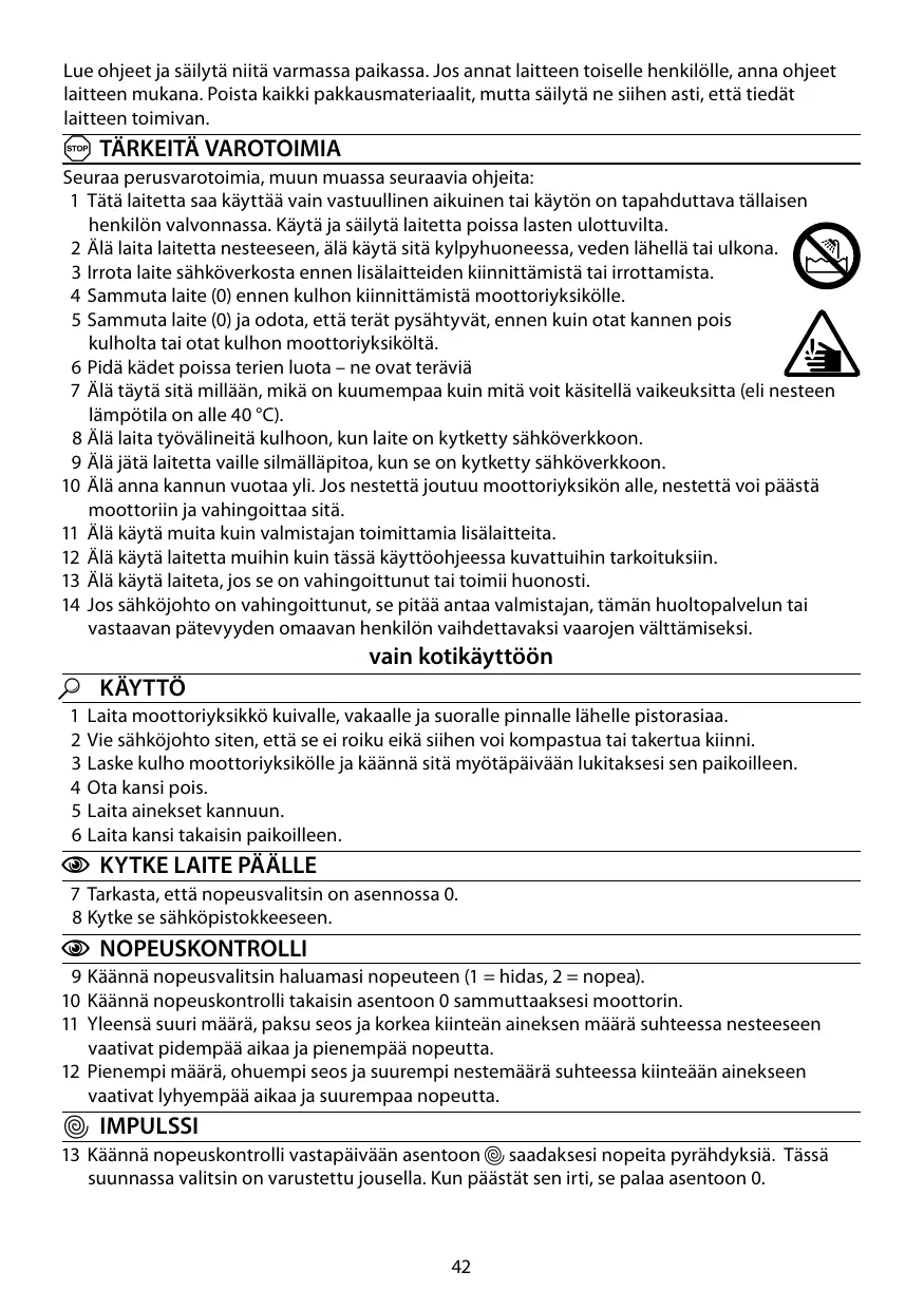 2 N’immergez pas l’appareil dans un liquide, ne l’utilisez pas dans une salle de bains, à proximité d’une source d’eau ou à l’extérieur. 3 Débranchez l’appareil avant d’adapter ou de retirer les accessoires. 4 Eteignez (0) avant de mettre le bol en place sur le bloc moteur. 5 Eteignez (0) et attendez jusqu’à ce que les lames s’arrêtent avant d’enlever le couvercle du bol ou avant d’enlever le bol du bloc moteur. 6 Tenez vos mains à l’écart des lames – elles sont tranchantes 7 Ne remplissez pas avec quelque chose de trop chaud qui n’est plus agréable au toucher pour vous (par ex. températures des liquides inférieures à 40°C). 8 Ne placez aucun ustensile dans le bol lorsque l’appareil est branché. 9 Ne laissez pas l’appareil sans surveillance lorsqu’il est branché. 10 Veillez à ce que le bol ne déborde pas. Tout liquide qui se met sous le bloc moteur pourrait être absorbé par le moteur et risquerait de l’endommager. 11 N’installez que des accessoires et des pièces de rechange qui proviennent du fabricant. 12 N’utilisez pas l’appareil dans un autre but que celui décrit dans ces instructions. 13 N’utilisez pas l’appareil s’il est endommagé ou ne fonctionne pas correctement. 14 Si le câble est abîmé, vous devez le faire remplacer par le fabricant, un de ses techniciens agréés ou une personne également qualifiée, pour éviter tout danger.