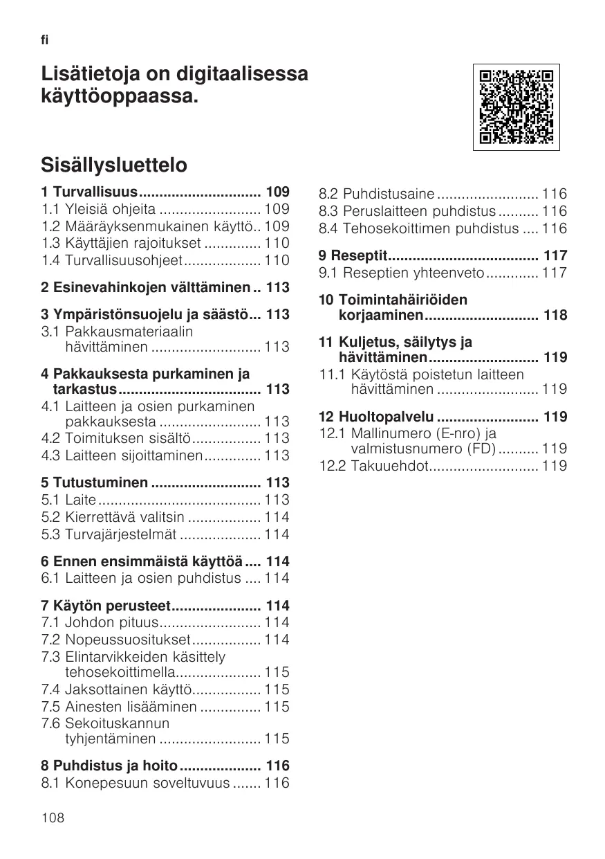 Lisätietoja on digitaalisessa käyttöoppaassa. Sisällysluettelo 1 Turvallisuus 109 1.1 Yleisiä ohjeita 109 1.2 Määräyksenmukainen käyttö.. 109 1.3 Käyttäjien rajoitukset 110 1.4 Turvallisuusohjeet 110 2 Esinevahinkojen välttäminen .. 113 3 Ympäristönsuojelu ja säästö... 113 3.1 Pakkausmateriaalin hävittäminen 113 4 Pakkauksesta purkaminen ja tarkastus 113 4.1 Laitteen ja osien purkaminen pakkauksesta 113 4.2 Toimituksen sisältö 113 4.3 Laitteen sijoittaminen 113 5 Tutustuminen 113 5.1 Laite 113 5.2 Kierrettävä valitsin 114 5.3 Turvajärjestelmät 114 6 Ennen ensimmäistä käyttöä .... 114 6.1 Laitteen ja osien puhdistus .... 114 7 Käytön perusteet 114 7.1 Johdon pituus 114 7.2 Nopeussuositukset 114 7.3 Elintarvikkeiden käsittely tehosekoittimella 115 7.4 Jaksottainen käyttö 115 7.5 Ainesten lisääminen 115 7.6 Sekoituskannun tyhjentäminen 115 8 Puhdistus ja hoito 116 8.1 Konepesuun soveltuvuus 116 108