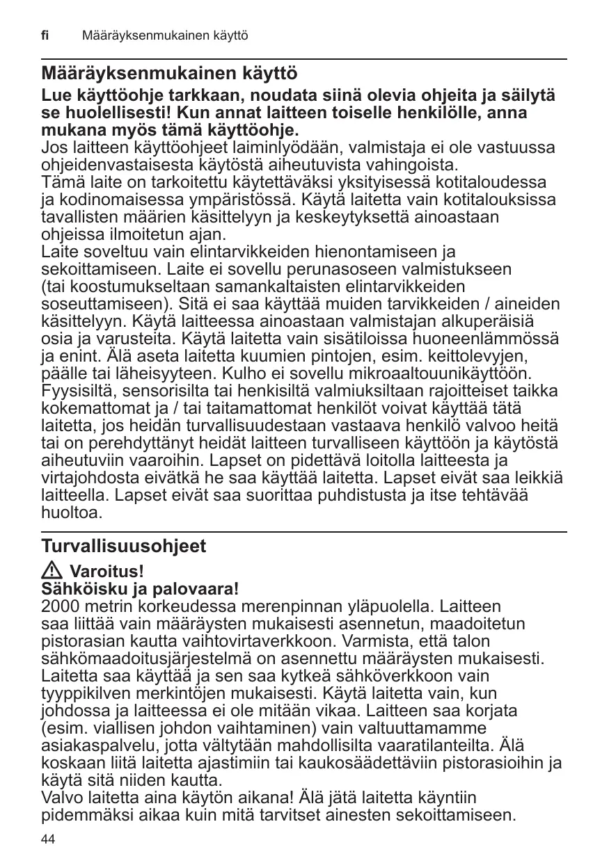 Määräyksenmukainen käyttö Määräyksenmukainen käyttö Lue käyttöohje tarkkaan, noudata siinä olevia ohjeita ja säilytä se huolellisesti! Kun annat laitteen toiselle henkilölle, anna mukana myös tämä käyttöohje. Jos laitteen käyttöohjeet laiminlyödään, valmistaja ei ole vastuussa ohjeidenvastaisesta käytöstä aiheutuvista vahingoista. Tämä laite on tarkoitettu käytettäväksi yksityisessä kotitaloudessa ja kodinomaisessa ympäristössä. Käytä laitetta vain kotitalouksissa tavallisten määrien käsittelyyn ja keskeytyksettä ainoastaan ohjeissa ilmoitetun ajan. Laite soveltuu vain elintarvikkeiden hienontamiseen ja sekoittamiseen. Laite ei sovellu perunasoseen valmistukseen (tai koostumukseltaan samankaltaisten elintarvikkeiden soseuttamiseen). Sitä ei saa käyttää muiden tarvikkeiden / aineiden käsittelyyn. Käytä laitteessa ainoastaan valmistajan alkuperäisiä osia ja varusteita. Käytä laitetta vain sisätiloissa huoneenlämmössä ja enint. Älä aseta laitetta kuumien pintojen, esim. keittolevyjen, päälle tai läheisyyteen. Kulho ei sovellu mikroaaltouunikäyttöön. Fyysisiltä, sensorisilta tai henkisiltä valmiuksiltaan rajoitteiset taikka kokemattomat ja / tai taitamattomat henkilöt voivat käyttää tätä laitetta, jos heidän turvallisuudestaan vastaava henkilö valvoo heitä tai on perehdyttänyt heidät laitteen turvalliseen käyttöön ja käytöstä aiheutuviin vaaroihin. Lapset on pidettävä loitolla laitteesta ja virtajohdosta eivätkä he saa käyttää laitetta. Lapset eivät saa leikkiä laitteella. Lapset eivät saa suorittaa puhdistusta ja itse tehtävää huoltoa. Turvallisuusohjeet W Varoitus! Sähköisku ja palovaara! 2000 metrin korkeudessa merenpinnan yläpuolella. Laitteen saa liittää vain määräysten mukaisesti asennetun, maadoitetun pistorasian kautta vaihtovirtaverkkoon. Varmista, että talon sähkömaadoitusjärjestelmä on asennettu määräysten mukaisesti. Laitetta saa käyttää ja sen saa kytkeä sähköverkkoon vain tyyppikilven merkintöjen mukaisesti. Käytä laitetta vain, kun johdossa ja laitteessa ei ole mitään vikaa. Laitteen saa korjata (esim. viallisen johdon vaihtaminen) vain valtuuttamamme asiakaspalvelu, jotta vältytään mahdollisilta vaaratilanteilta. Älä koskaan liitä laitetta ajastimiin tai kaukosäädettäviin pistorasioihin ja käytä sitä niiden kautta. Valvo laitetta aina käytön aikana! Älä jätä laitetta käyntiin pidemmäksi aikaa kuin mitä tarvitset ainesten sekoittamiseen.
