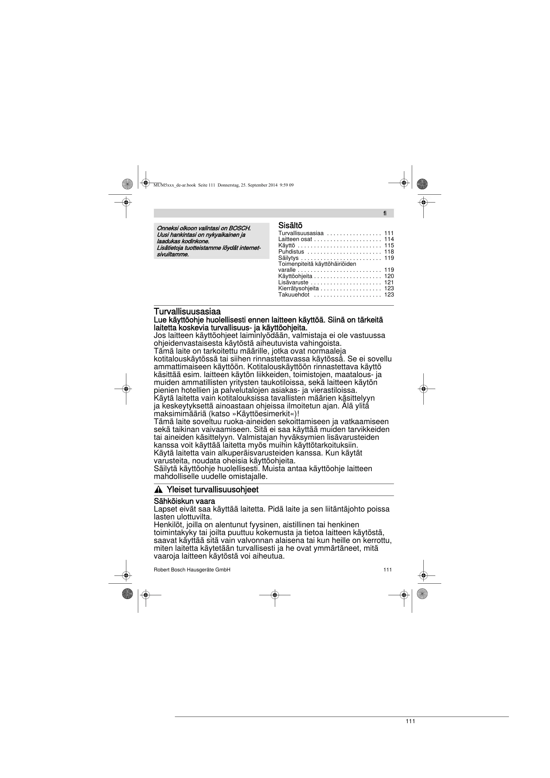 , Yleiset turvallisuusohjeet Sähköiskun vaara Lapset eivät saa käyttää laitetta. Pidä laite ja sen liitäntäjohto poissa lasten ulottuvilta. Henkilöt, joilla on alentunut fyysinen, aistillinen tai henkinen toimintakyky tai joilta puuttuu kokemusta ja tietoa laitteen käytöstä, saavat käyttää sitä vain valvonnan alaisena tai kun heille on kerrottu, miten laitetta käytetään turvallisesti ja he ovat ymmärtäneet, mitä vaaroja laitteen käytöstä voi aiheutua. Robert Bosch Hausgeräte GmbH