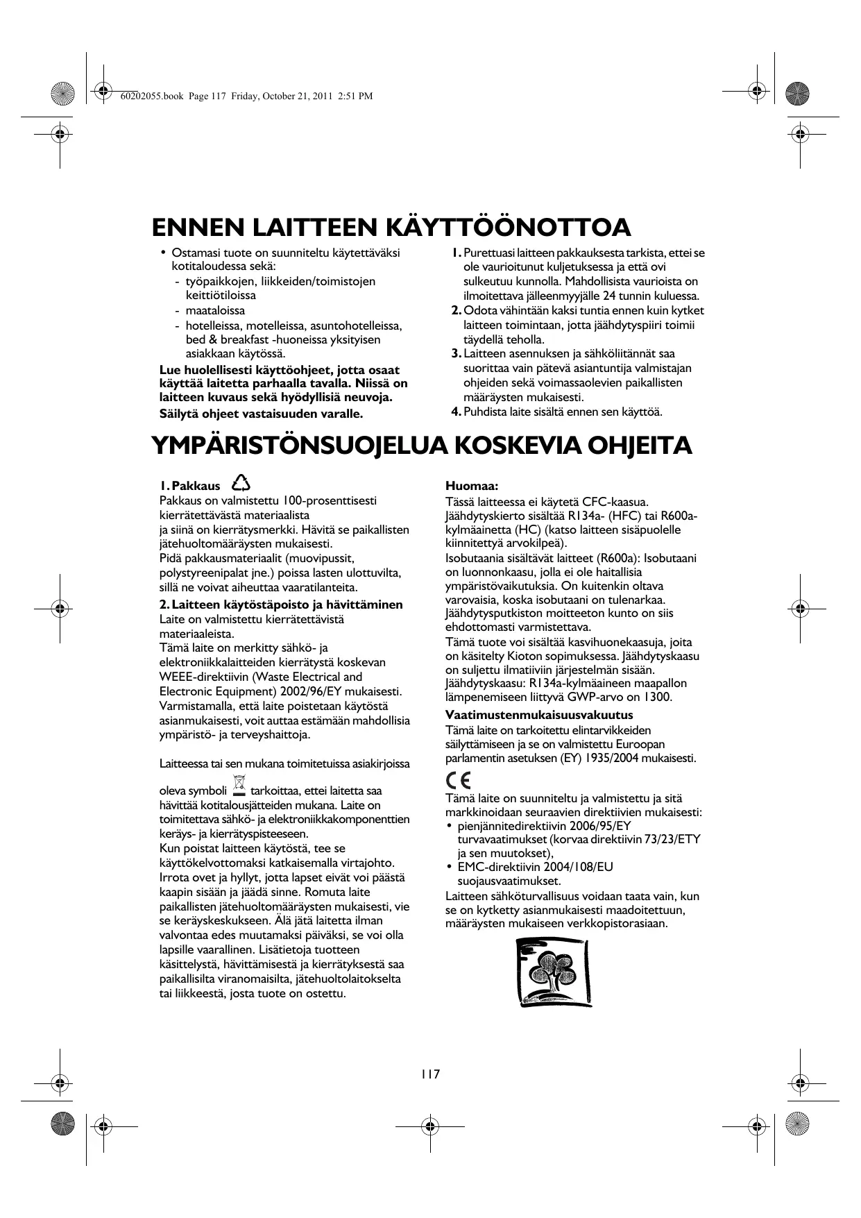 Laite on valmistettu kierrätettävistä materiaaleista. Tämä laite on merkitty sähkö- ja elektroniikkalaitteiden kierrätystä koskevan WEEE-direktiivin (Waste Electrical and Electronic Equipment) 2002/96/EY mukaisesti. Varmistamalla, että laite poistetaan käytöstä asianmukaisesti, voit auttaa estämään mahdollisia ympäristö- ja terveyshaittoja. Huomaa: Tässä laitteessa ei käytetä CFC-kaasua. Jäähdytyskierto sisältää R134a- (HFC) tai R600akylmäainetta (HC) (katso laitteen sisäpuolelle kiinnitettyä arvokilpeä). Isobutaania sisältävät laitteet (R600a): Isobutaani on luonnonkaasu, jolla ei ole haitallisia ympäristövaikutuksia. On kuitenkin oltava varovaisia, koska isobutaani on tulenarkaa. Jäähdytysputkiston moitteeton kunto on siis ehdottomasti varmistettava. Tämä tuote voi sisältää kasvihuonekaasuja, joita on käsitelty Kioton sopimuksessa. Jäähdytyskaasu on suljettu ilmatiiviin järjestelmän sisään. Jäähdytyskaasu: R134a-kylmäaineen maapallon lämpenemiseen liittyvä GWP-arvo on 1300. Vaatimustenmukaisuusvakuutus Tämä laite on tarkoitettu elintarvikkeiden säilyttämiseen ja se on valmistettu Euroopan parlamentin asetuksen (EY) 1935/2004 mukaisesti. Laitteessa tai sen mukana toimitetuissa asiakirjoissa oleva symboli tarkoittaa, ettei laitetta saa hävittää kotitalousjätteiden mukana. Laite on toimitettava sähkö- ja elektroniikkakomponenttien keräys- ja kierrätyspisteeseen. Kun poistat laitteen käytöstä, tee se käyttökelvottomaksi katkaisemalla virtajohto. Irrota ovet ja hyllyt, jotta lapset eivät voi päästä kaapin sisään ja jäädä sinne. Romuta laite paikallisten jätehuoltomääräysten mukaisesti, vie se keräyskeskukseen. Älä jätä laitetta ilman valvontaa edes muutamaksi päiväksi, se voi olla lapsille vaarallinen. Lisätietoja tuotteen käsittelystä, hävittämisestä ja kierrätyksestä saa paikallisilta viranomaisilta, jätehuoltolaitokselta tai liikkeestä, josta tuote on ostettu. Tämä laite on suunniteltu ja valmistettu ja sitä markkinoidaan seuraavien direktiivien mukaisesti: