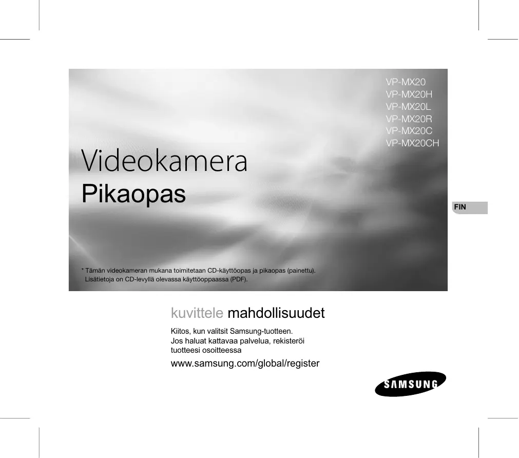 - Tämän videokameran mukana toimitetaan CD-käyttöopas ja pikaopas (painettu). Lisätietoja on CD-levyllä olevassa käyttöoppaassa (PDF). kuvittele mahdollisuudet Kiitos, kun valitsit Samsung-tuotteen. Jos haluat kattavaa palvelua, rekisteröi tuotteesi osoitteessa www.samsung.com/global/register VP-MX20 VP-MX20H VP-MX20L VP-MX20R VP-MX20C VP-MX20CH FIN videokameran käyttöön perehtyminen