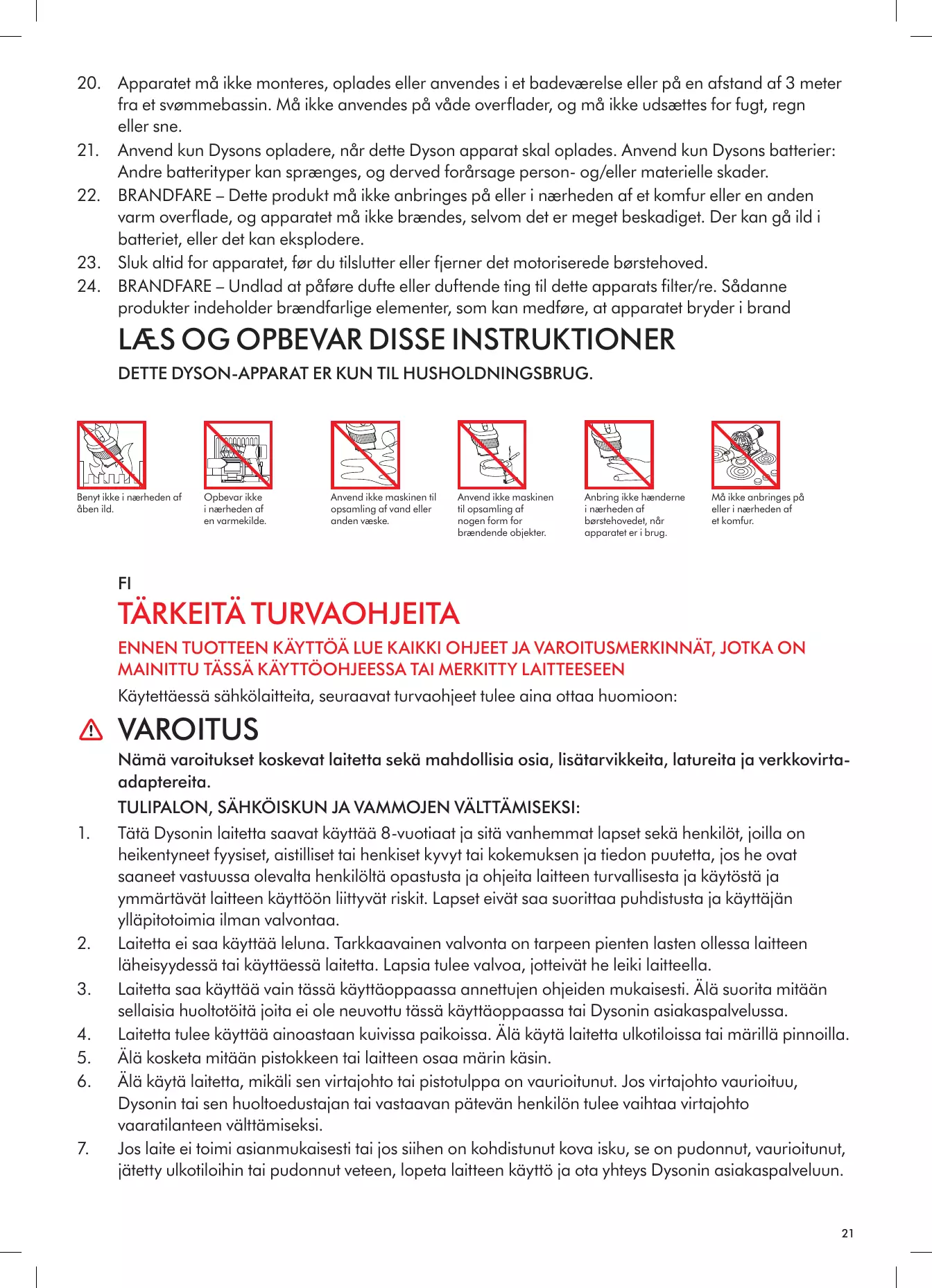 5. N’utilisez pas l’appareil si la prise ou le cordon est endommagé. Si le cordon d’alimentation est endommagé, il doit être remplacé par Dyson, par l'une des personnes agréées afin d’éviter tout danger. Si l’appareil ne fonctionne pas correctement, a reçu un choc violent, est tombé, a été endommagé, été entreposé dehors ou a été immergé dans l’eau, ne l’utilisez pas et contactez le Service consommateurs Dyson. Contactez le service consommateurs Dyson si votre appareil Dyson nécessite un entretien ou une réparation. Ne démontez pas l’appareil car un remontage incorrect risque d’entraîner un choc électrique ou un incendie. N’étirez pas le câble et n’exercez pas de tension dessus. Maintenez le câble à l’écart des surfaces chauffées. Ne fermez pas de porte sur le câble et ne tirez pas sur le câble lorsqu’il se trouve à proximité d’angles ou de coins. Maintenez le câble à l’écart des zones de passage, à un endroit où personne n’est susceptible de marcher ou de trébucher dessus. Ne faites pas rouler l’appareil sur le câble. Ne débranchez pas en tirant sur le câble d’alimentation. Pour débrancher, saisissez la prise et non le câble. L’utilisation d’une rallonge n’est pas recommandée. N’utilisez pas l’appareil pour aspirer de l’eau. N’utilisez pas l’appareil pour aspirer des liquides inflammables ou combustibles comme l’essence, ou dans des endroits où un liquide de ce type pourrait être présent. N’aspirez rien qui brule ou qui fume, comme des cigarettes, des allumettes ou des cendres incandescentes. Éloignez les cheveux, les vêtements amples, les doigts et toute autre partie du corps des ouvertures et des pièces mobiles de l’appareil, notamment de la brosse rotative. Ne dirigez pas le flexible, le tube ou les accessoires vers les yeux ou les oreilles et ne les portez pas à la bouche. Ne placez pas d’objets dans les ouvertures de l’appareil. N'utilisez pas l’appareil en cas d’obstruction d’une ouverture. Assurez-vous que rien ne réduit le flux d’air : poussières, peluches, cheveux ou autres. N’utilisez que les accessoires et pièces de rechange recommandés par Dyson. N’utilisez pas l’appareil si le collecteur transparent et les filtres ne sont pas en place. Débranchez l’appareil lorsqu’il n’est pas utilisé pendant une période prolongée et avant tout entretien ou nettoyage. Redoublez de prudence lors de l’utilisation dans les escaliers. N’installez pas, ne rechargez pas et n’utilisez pas cet appareil à l’extérieur, dans une salle de bains ou à moins de 3 mètres d’une piscine. Ne l’utilisez pas sur une surface humide et ne l’exposez pas à l’humidité, la pluie ou la neige. Utilisez uniquement des chargeurs Dyson pour recharger cet appareil. Utilisez uniquement des batteries Dyson : les autres types de batteries peuvent exploser et provoquer des blessures et des dommages. RISQUE D’INCENDIE – Ne placez pas ce produit sur (ou à proximité) d’une cuisinière ou autre surface et ne l’incinérez pas même s’il est fortement endommagé. La batterie risque de prendre feu ou d’exploser. Éteignez toujours l’appareil avant de brancher ou de débrancher la brosse motorisée. RISQUE D’INCENDIE – N’appliquez pas de parfum ou de produit parfumé sur le(s) filtre(s) de cet appareil. Les substances chimiques contenues dans ces produits sont connues pour leur caractère inflammable et peuvent enflammer l’appareil.
