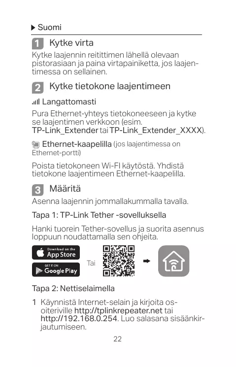 Suomi 1 Kytke virta Kytke laajennin reitittimen lähellä olevaan pistorasiaan ja paina virtapainiketta, jos laajentimessa on sellainen. 2 Kytke tietokone laajentimeen Langattomasti Pura Ethernet-yhteys tietokoneeseen ja kytke se laajentimen verkkoon (esim. TP-Link_Extender tai TP-Link_Extender_XXXX). Ethernet-kaapelilla (jos laajentimessa on Ethernet-portti) Poista tietokoneen Wi-FI käytöstä. Yhdistä tietokone laajentimeen Ethernet-kaapelilla. 3 Määritä Asenna laajennin jommallakummalla tavalla. Tapa 1: TP-Link Tether -sovelluksella Hanki tuorein Tether-sovellus ja suorita asennus loppuun noudattamalla sen ohjeita. Tai Tapa 2: Nettiselaimella 1 Käynnistä Internet-selain ja kirjoita osoiteriville http://tplinkrepeater.net tai http://192.168.0.254. Luo salasana sisäänkirjautumiseen.