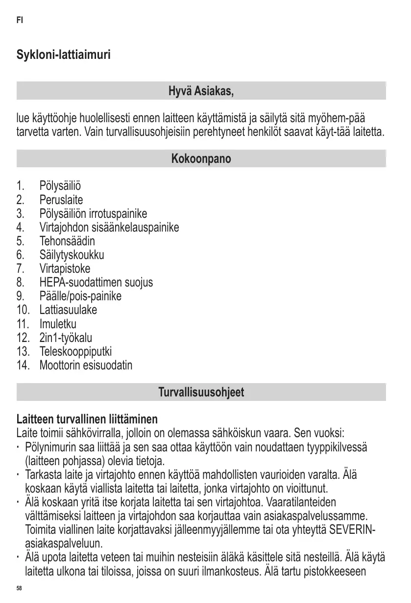 - Alä koskaan yritä itse korjata laitetta tai sen virtajohtoa. Vaaratilanteiden välttämiseksi laitteen ja virtajohdon saa korjauttaa vain asiakaspalvelussamme. Toimita viallinen laite korjattavaksi jalleenmyyyjällemme tai ota yhteytä SEVERIN-asiakaspalveluun.