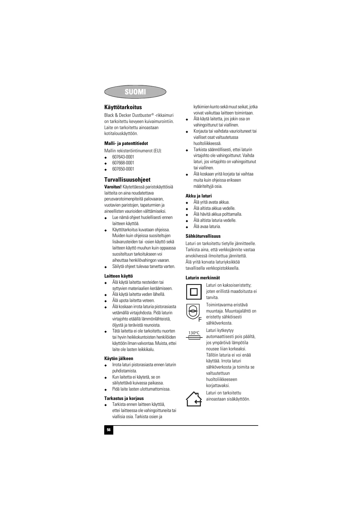 Téléchargez la notice de votre Pölynimuri au format PDF gratuitement ! Retrouvez votre notice DV 1205 - BLACK & DECKER et reprennez votre appareil électronique en main. Sur cette page sont publiés tous les documents nécessaires à l'utilisation de votre appareil DV 1205 de la marque BLACK & DECKER.