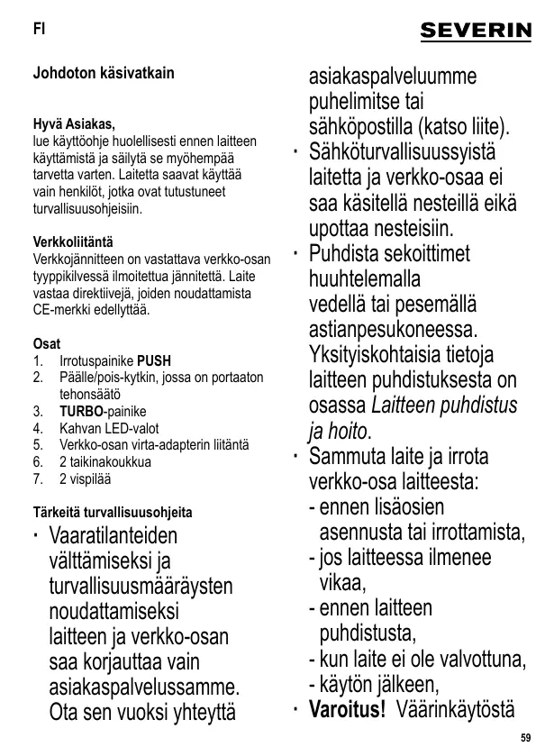 Téléchargez la notice de votre Sähkövatkain au format PDF gratuitement ! Retrouvez votre notice SSFILHM3843 - SEVERIN et reprennez votre appareil électronique en main. Sur cette page sont publiés tous les documents nécessaires à l'utilisation de votre appareil SSFILHM3843 de la marque SEVERIN.