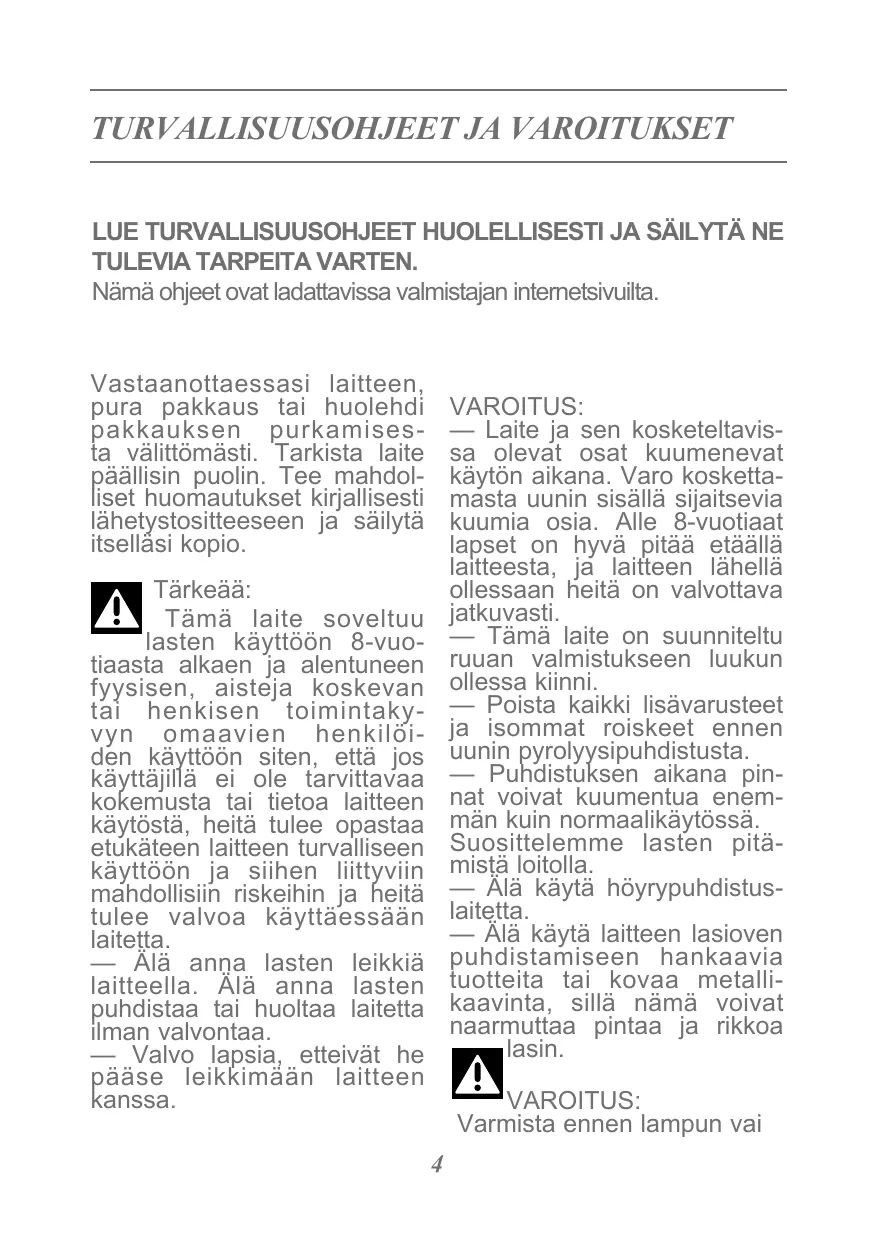 Cet appareil peut être utilisé par des enfants âgés de 8 ans et plus, et par des personnes aux capacités physiques, sensorielles ou mentales réduites, ou dénuées d’expérience et de connaissance, si elles ont pu bénéficier d’une surveillance ou d’instructions préalables concernant l’utilisation de l’appareil de façon sûre et en ont compris les risques encourus. — Les enfants ne doivent pas jouer avec l’appareil. Les opérations de nettoyage et de maintenance ne doivent pas être faites par des enfants laissés sans surveillance. — Il convient de surveiller les enfants pour s’assurer qu’ils ne jouent pas avec l’appareil. 4