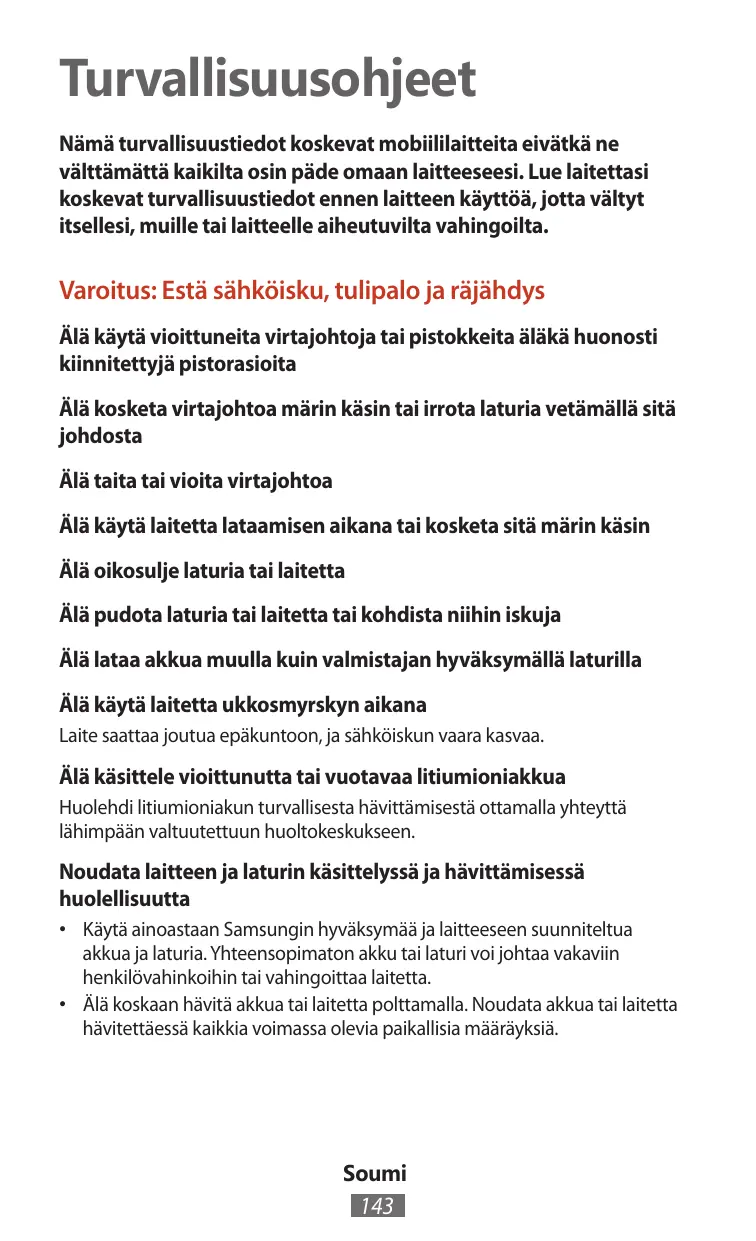 Turvallisuusohjeet Nämä turvallisuustiedot koskevat mobiililaitteita eivätkä ne välttämättä kaikilta osin päde omaan laitteeseesi. Lue laitettasi koskevat turvallisuustiedot ennen laitteen käyttöä, jotta vältyt itsellesi, muille tai laitteelle aiheutuvilta vahingoilta. Varoitus: Estä sähköisku, tulipalo ja räjähdys Älä käytä vioittuneita virtajohtoja tai pistokkeita äläkä huonosti kiinnitettyjä pistorasioita Älä kosketa virtajohtoa märin käsin tai irrota laturia vetämällä sitä johdosta Älä taita tai vioita virtajohtoa Älä käytä laitetta lataamisen aikana tai kosketa sitä märin käsin Älä oikosulje laturia tai laitetta Älä pudota laturia tai laitetta tai kohdista niihin iskuja Älä lataa akkua muulla kuin valmistajan hyväksymällä laturilla Älä käytä laitetta ukkosmyrskyn aikana Laite saattaa joutua epäkuntoon, ja sähköiskun vaara kasvaa. Älä käsittele vioittunutta tai vuotavaa litiumioniakkua Huolehdi litiumioniakun turvallisesta hävittämisestä ottamalla yhteyttä lähimpään valtuutettuun huoltokeskukseen. Noudata laitteen ja laturin käsittelyssä ja hävittämisessä huolellisuutta