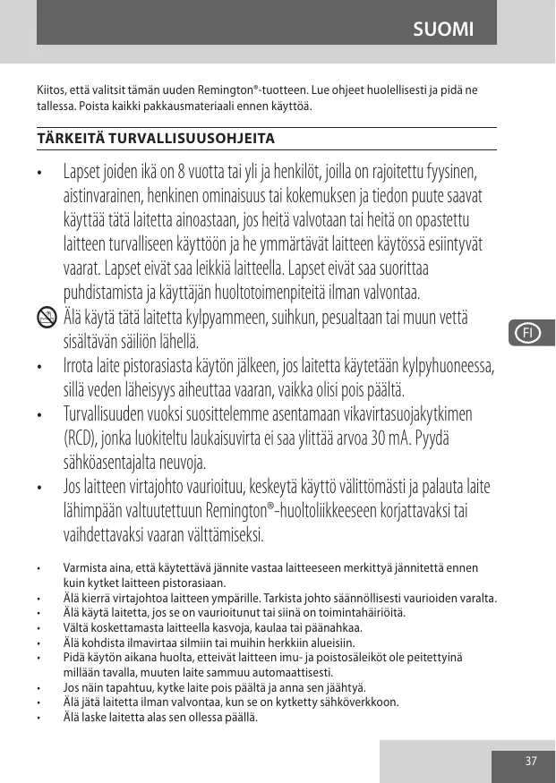 • Lorsque l’appareil est utilisé dans une salle de bains, débranchez-le après usage. La proximité de l’eau présente un danger même lorsque l’appareil est éteint. • Pour une protection supplémentaire, l’installation de courant résiduel (RCD) avec un differentiel residuel nominal ne dépassant pas 30mA est recommandée. Demandez de l’aide à un électricien. • Si le cordon d’alimentation de cet appareil est endommagé, cessez immédiatement d’utiliser l’appareil et renvoyez-le au service consommateurs Remington agréé le plus proche en vue de sa réparation ou de sa substitution afin d’éviter tout risque.