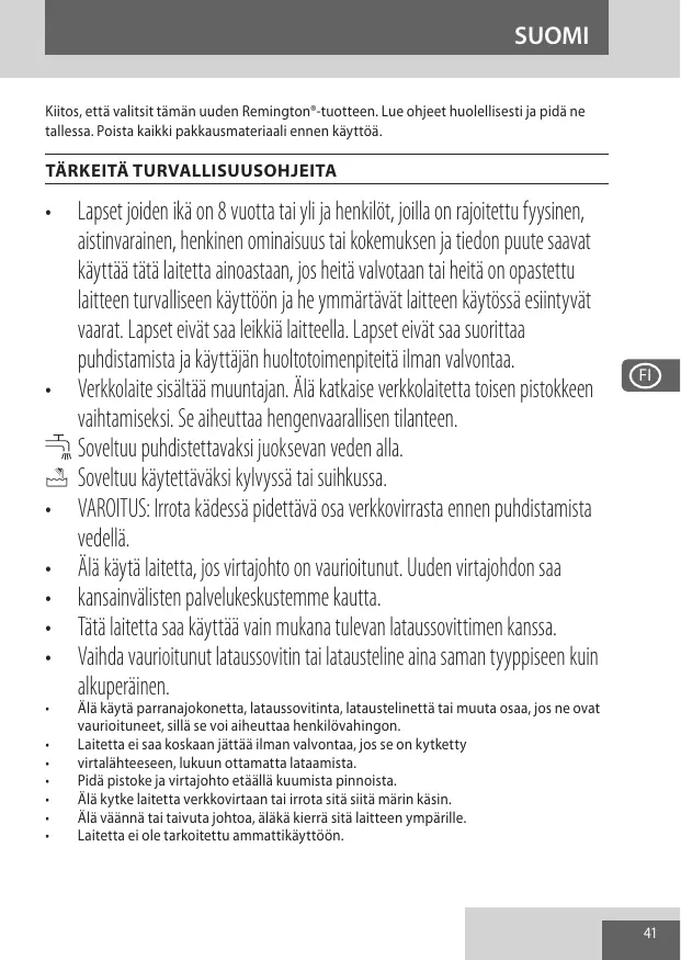 SUOMI Kiitos, että valitsit tämän uuden Remington®-tuotteen. Lue ohjeet huolellisesti ja pidä ne tallessa. Poista kaikki pakkausmateriaali ennen käyttöä.