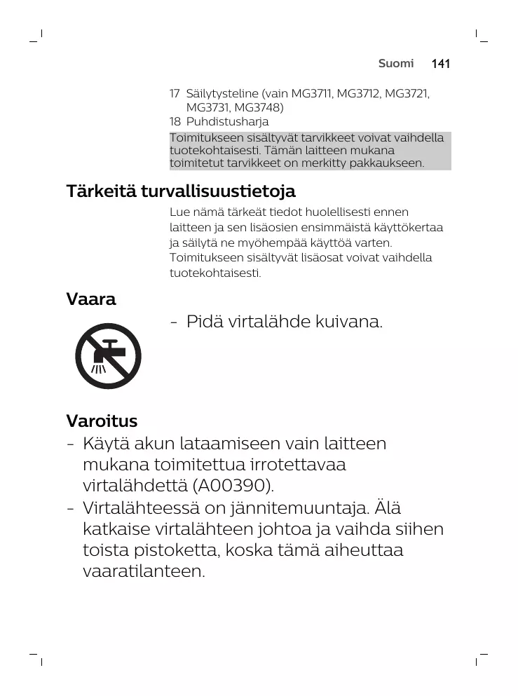 - Laitetta voivat käyttää myös yli 8-vuotiaat lapset ja henkilöt, joiden fyysinen tai henkinen toimintakyky on rajoittunut tai joilla ei ole kokemusta tai tietoa laitteen käytöstä, jos heitä on neuvottu laitteen turvallisesta käytöstä tai tarjolla on turvallisen käytön edellyttämä valvonta ja jos he ymmärtävät laitteeseen liittyvät vaarat. Lasten ei pidä leikkiä laitteella. Lasten ei saa antaa puhdistaa tai huoltaa laitetta ilman valvontaa. - Tarkista laite aina ennen kuin käytät sitä. Älä käytä laitetta, jos se on vaurioitunut, koska sen käyttö saattaa tällöin aiheuttaa vammoja. Vaihda vahingoittuneen osan tilalle aina alkuperäisen tyyppinen osa. - Älä avaa laitetta akun vaihtamista varten. Varoitus - Tätä laitetta ei voi pestä. Älä koskaan upota sitä veteen äläkä huuhtele sitä vesihanan alla.