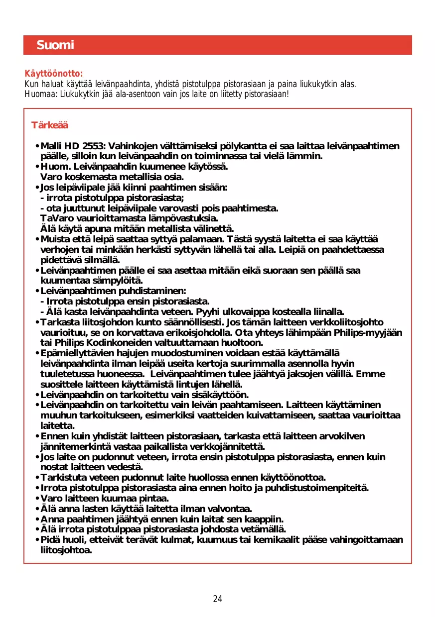 Suomi Käyttöönotto: Kun haluat käyttää leivänpaahdinta, yhdistä pistotulppa pistorasiaan ja paina liukukytkin alas. Huomaa: Liukukytkin jää ala-asentoon vain jos laite on liitetty pistorasiaan! Tärkeää • Malli HD 2553: Vahinkojen välttämiseksi pölykantta ei saa laittaa leivänpaahtimen päälle, silloin kun leivänpaahdin on toiminnassa tai vielä lämmin. • Huom. Leivänpaahdin kuumenee käytössä. Varo koskemasta metallisia osia. • Jos leipäviipale jää kiinni paahtimen sisään: - irrota pistotulppa pistorasiasta; - ota juuttunut leipäviipale varovasti pois paahtimesta. TaVaro vaurioittamasta lämpövastuksia. Älä käytä apuna mitään metallista välinettä. • Muista että leipä saattaa syttyä palamaan. Tästä syystä laitetta ei saa käyttää verhojen tai minkään herkästi syttyvän lähellä tai alla. Leipiä on paahdettaessa pidettävä silmällä. • Leivänpaahtimen päälle ei saa asettaa mitään eikä suoraan sen päällä saa kuumentaa sämpylöitä. • Leivänpaahtimen puhdistaminen: - Irrota pistotulppa ensin pistorasiasta. - Älä kasta leivänpaahdinta veteen. Pyyhi ulkovaippa kostealla liinalla. • Tarkasta liitosjohdon kunto säännöllisesti. Jos tämän laitteen verkkoliitosjohto vaurioituu, se on korvattava erikoisjohdolla. Ota yhteys lähimpään Philips-myyjään tai Philips Kodinkoneiden valtuuttamaan huoltoon. • Epämiellyttävien hajujen muodostuminen voidaan estää käyttämällä leivänpaahdinta ilman leipää useita kertoja suurimmalla asennolla hyvin tuuletetussa huoneessa. Leivänpaahtimen tulee jäähtyä jaksojen välillä. Emme suosittele laitteen käyttämistä lintujen lähellä. • Leivänpaahdin on tarkoitettu vain sisäkäyttöön. • Leivänpaahdin on tarkoitettu vain leivän paahtamiseen. Laitteen käyttäminen muuhun tarkoitukseen, esimerkiksi vaatteiden kuivattamiseen, saattaa vaurioittaa laitetta. • Ennen kuin yhdistät laitteen pistorasiaan, tarkasta että laitteen arvokilven jännitemerkintä vastaa paikallista verkkojännitettä. • Jos laite on pudonnut veteen, irrota ensin pistotulppa pistorasiasta, ennen kuin nostat laitteen vedestä. • Tarkistuta veteen pudonnut laite huollossa ennen käyttöönottoa. • Irrota pistotulppa pistorasiasta aina ennen hoito ja puhdistustoimenpiteitä. • Varo laitteen kuumaa pintaa. • Älä anna lasten käyttää laitetta ilman valvontaa. • Anna paahtimen jäähtyä ennen kuin laitat sen kaappiin. • Älä irrota pistotulppaa pistorasiasta johdosta vetämällä. • Pidä huoli, etteivät terävät kulmat, kuumuus tai kemikaalit pääse vahingoittamaan liitosjohtoa.