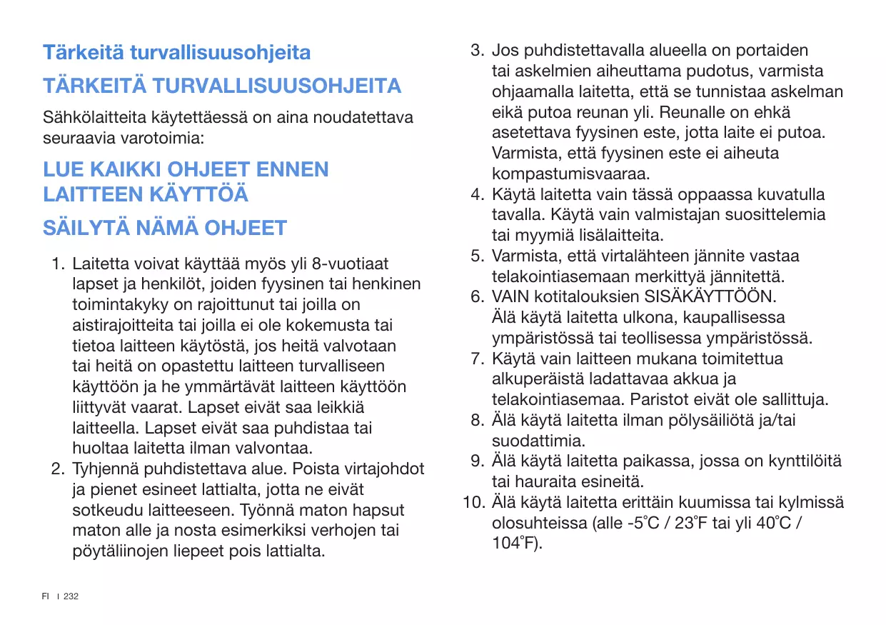 LUE KAIKKI OHJEET ENNEN LAITTEEN KÄYTTÖÄ SÄILYTÄ NÄMÄ OHJEET 1. Laitetta voivat käyttää myös yli 8-vuotiaat lapset ja henkilöt, joiden fyysinen tai henkinen toimintakyky on rajoittunut tai joilla on aistirajoitteita tai joilla ei ole kokemusta tai tietoa laitteen käytöstä, jos heitä valvotaan tai heitä on opastettu laitteen turvalliseen käyttöön ja he ymmärtävät laitteen käyttöön liittyvät vaarat. Lapset eivät saa leikkiä laitteella. Lapset eivät saa puhdistaa tai huoltaa laitetta ilman valvontaa. 2. Tyhjennä puhdistettava alue. Poista virtajohdot ja pienet esineet lattialta, jotta ne eivät sotkeudu laitteeseen. Työnnä maton hapsut maton alle ja nosta esimerkiksi verhojen tai pöytäliinojen liepeet pois lattialta. FI