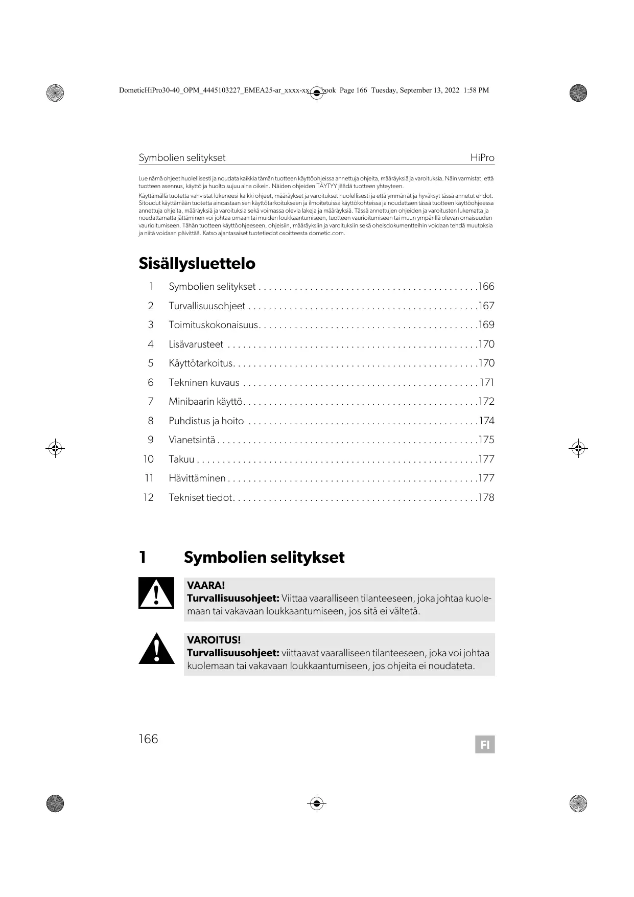 Lue nämä ohjeet huolellisesti ja noudata kaikkia tämän tuotteen käyttöohjeissa annettuja ohjeita, määräyksiä ja varoituksia. Näin varmistat, että tuotteen asennus, käyttö ja huolto sujuu aina oikein. Näiden ohjeiden TÄYTYY jäädä tuotteen yhteyteen. Käyttämällä tuotetta vahvistat lukeneesi kaikki ohjeet, määräykset ja varoitukset huolellisesti ja että ymmärrät ja hyväksyt tässä annetut ehdot. Sitoudut käyttämään tuotetta ainoastaan sen käyttötarkoitukseen ja ilmoitetuissa käyttökohteissa ja noudattaen tässä tuotteen käyttöohjeessa annettuja ohjeita, määräyksiä ja varoituksia sekä voimassa olevia lakeja ja määräyksiä. Tässä annettujen ohjeiden ja varoitusten lukematta ja noudattamatta jättäminen voi johtaa omaan tai muiden loukkaantumiseen, tuotteen vaurioitumiseen tai muun ympärillä olevan omaisuuden vaurioitumiseen. Tähän tuotteen käyttöohjeeseen, ohjeisiin, määräyksiin ja varoituksiin sekä oheisdokumentteihin voidaan tehdä muutoksia ja niitä voidaan päivittää. Katso ajantasaiset tuotetiedot osoitteesta dometic.com.