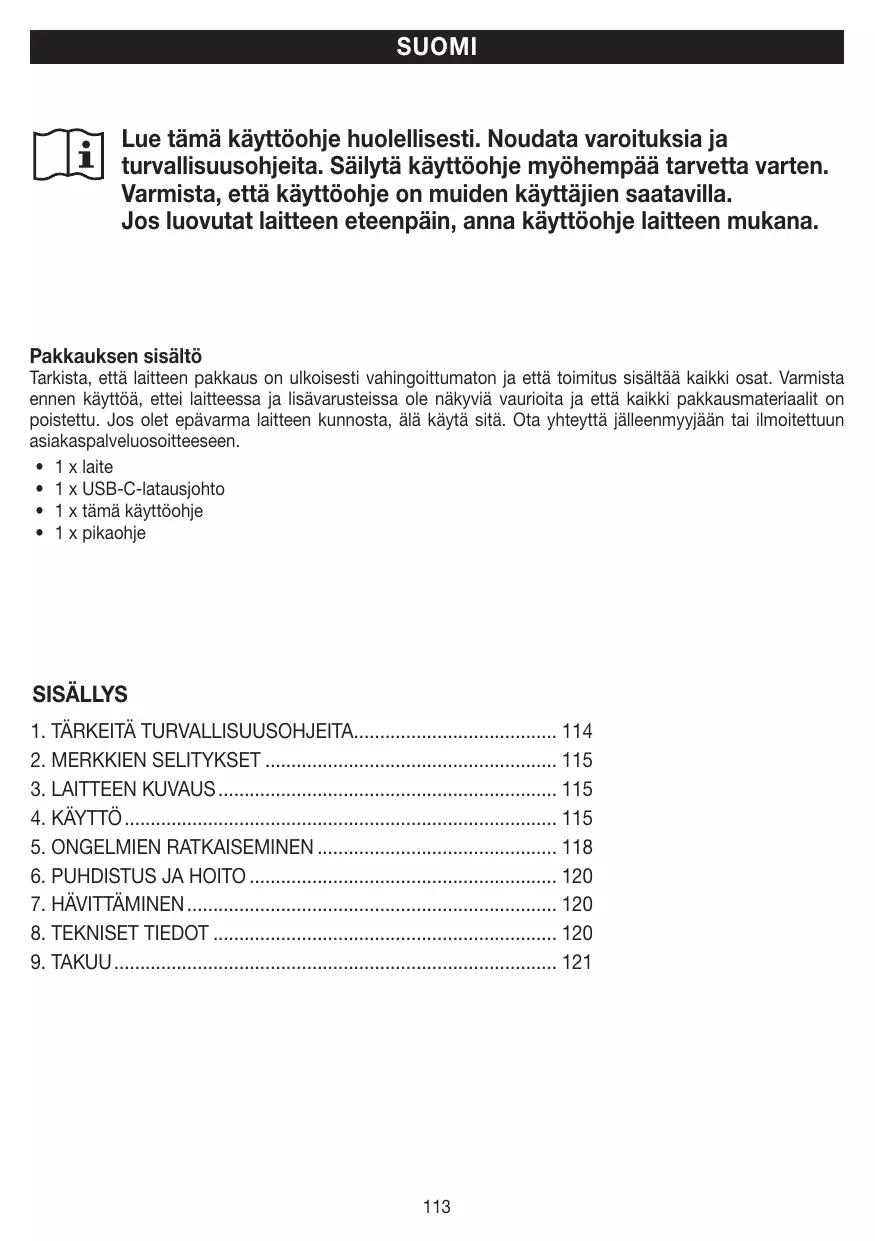 SUOMI Lue tämä käyttöohje huolellisesti. Noudata varoituksia ja turvallisuusohjeita. Säilytä käyttöohje myöhempää tarvetta varten. Varmista, että käyttöohje on muiden käyttäjien saatavilla. Jos luovutat laitteen eteenpäin, anna käyttöohje laitteen mukana.