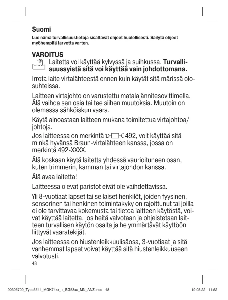 Suomi Lue nämä turvallisuustietoja sisältävät ohjeet huolellisesti. Säilytä ohjeet myöhempää tarvetta varten. VAROITUS Laitetta voi käyttää kylvyssä ja suihkussa. Turvallisuussyistä sitä voi käyttää vain johdottomana. Irrota laite virtalähteestä ennen kuin käytät sitä märissä olosuhteissa. Laitteen virtajohto on varustettu matalajännitesovittimella. Älä vaihda sen osia tai tee siihen muutoksia. Muutoin on olemassa sähköiskun vaara. Käytä ainoastaan laitteen mukana toimitettua virtajohtoa/ johtoja. 492, voit käyttää sitä Jos laitteessa on merkintä minkä hyvänsä Braun-virtalähteen kanssa, jossa on merkintä 492-XXXX. Älä koskaan käytä laitetta yhdessä vaurioituneen osan, kuten trimmerin, kamman tai virtajohdon kanssa. Älä avaa laitetta! Laitteessa olevat paristot eivät ole vaihdettavissa. Yli 8-vuotiaat lapset tai sellaiset henkilöt, joiden fyysinen, sensorinen tai henkinen toimintakyky on rajoittunut tai joilla ei ole tarvittavaa kokemusta tai tietoa laitteen käytöstä, voivat käyttää laitetta, jos heitä valvotaan ja ohjeistetaan laitteen turvallisen käytön osalta ja he ymmärtävät käyttöön liittyvät vaaratekijät. Jos laitteessa on hiustenleikkuulisäosa, 3-vuotiaat ja sitä vanhemmat lapset voivat käyttää sitä hiustenleikkuuseen valvotusti.