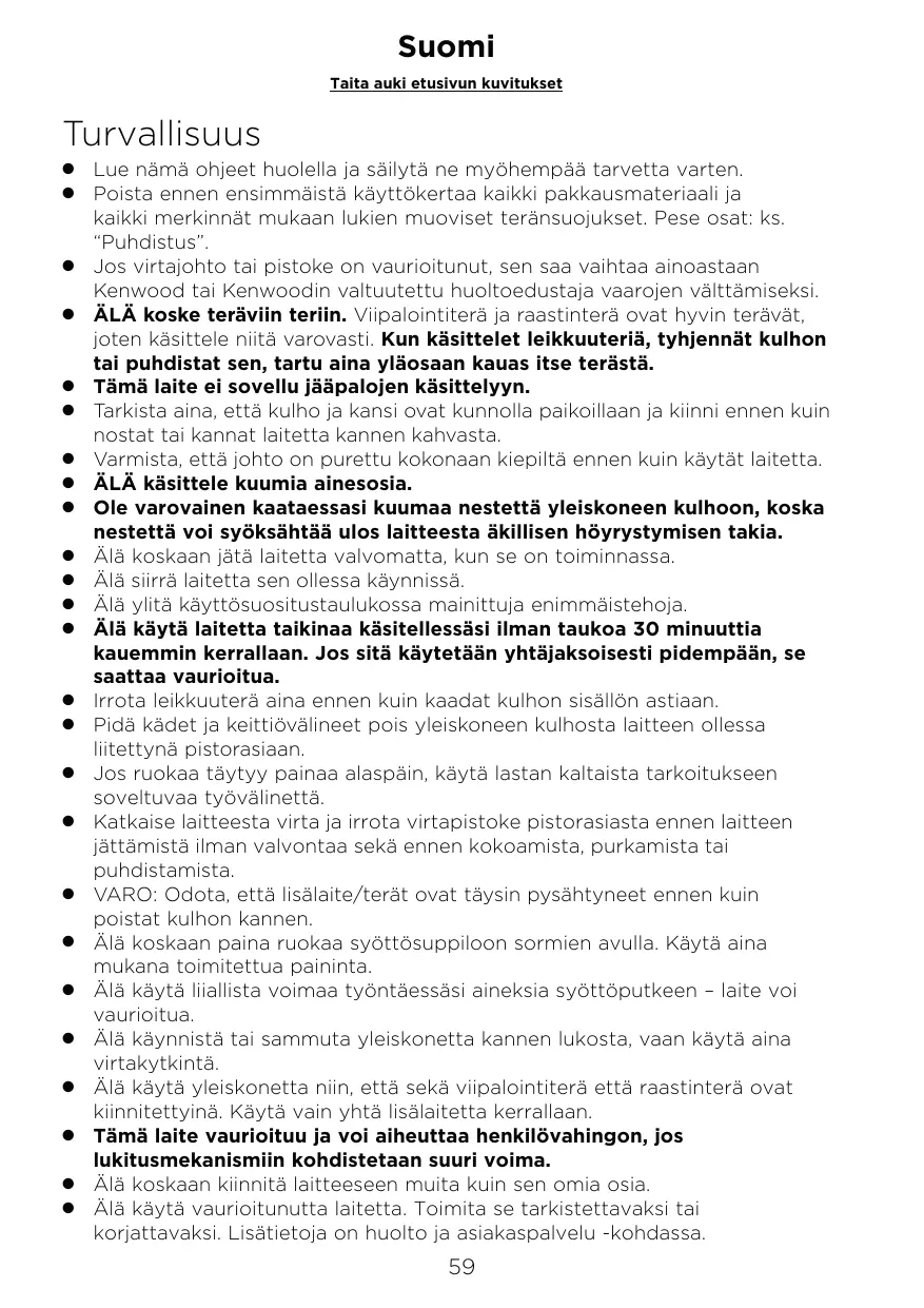 N’utilisez jamais un appareil endommagé. Faites-le vérifier ou réparer : voir « Service après-vente ». Ne mouillez jamais le bloc moteur, le cordon d’alimentation ou la prise. Ne laissez pas le cordon d’alimentation dépasser du bord d’une table, du plan de travail ou être en contact avec des surfaces chaudes. Les enfants doivent être surveillés afin qu’ils ne puissent pas jouer avec cet appareil. Cet appareil ne doit pas être utilisé par des enfants. Veuillez garder l’appareil et le cordon hors de portée des enfants. Les appareils peuvent être utilisés par des personnes dont les capacités physiques, sensorielles ou mentales sont diminuées, ou qui ne disposent pas des connaissances ou de l’expérience nécessaires, si elles ont été formées et encadrées pour l’utilisation des appareils, et si elles ont conscience des risques encourus. N’employez l’appareil qu’à la fin domestique prévue. Kenwood décline toute responsabilité dans les cas où l’appareil est utilisé incorrectement ou quand les présentes instructions ne sont pas respectées. Une mauvaise utilisation de votre appareil peut provoquer des blessures.