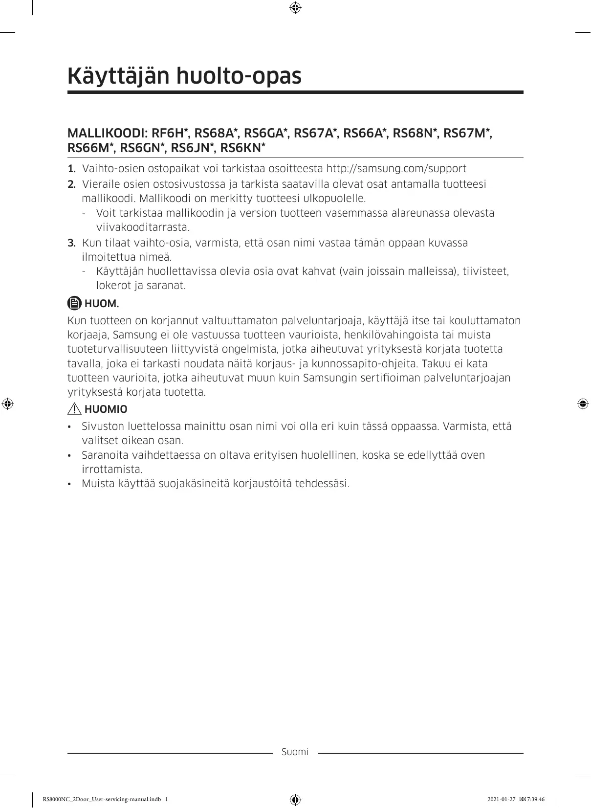 Käyttäjän huolto-opas MALLIKOODI: RF6H*, RS68A*, RS6GA*, RS67A*, RS66A*, RS68N*, RS67M*, RS66M*, RS6GN*, RS6JN*, RS6KN* 1. Vaihto-osien ostopaikat voi tarkistaa osoitteesta http://samsung.com/support 2. Vieraile osien ostosivustossa ja tarkista saatavilla olevat osat antamalla tuotteesi mallikoodi. Mallikoodi on merkitty tuotteesi ulkopuolelle. - Voit tarkistaa mallikoodin ja version tuotteen vasemmassa alareunassa olevasta viivakooditarrasta. 3. Kun tilaat vaihto-osia, varmista, että osan nimi vastaa tämän oppaan kuvassa ilmoitettua nimeä. - Käyttäjän huollettavissa olevia osia ovat kahvat (vain joissain malleissa), tiivisteet, lokerot ja saranat. HUOM. Kun tuotteen on korjannut valtuuttamaton palveluntarjoaja, käyttäjä itse tai kouluttamaton korjaaja, Samsung ei ole vastuussa tuotteen vaurioista, henkilövahingoista tai muista tuoteturvallisuuteen liittyvistä ongelmista, jotka aiheutuvat yrityksestä korjata tuotetta tavalla, joka ei tarkasti noudata näitä korjaus- ja kunnossapito-ohjeita. Takuu ei kata tuotteen vaurioita, jotka aiheutuvat muun kuin Samsungin sertifioiman palveluntarjoajan yrityksestä korjata tuotetta. HUOMIO • • •