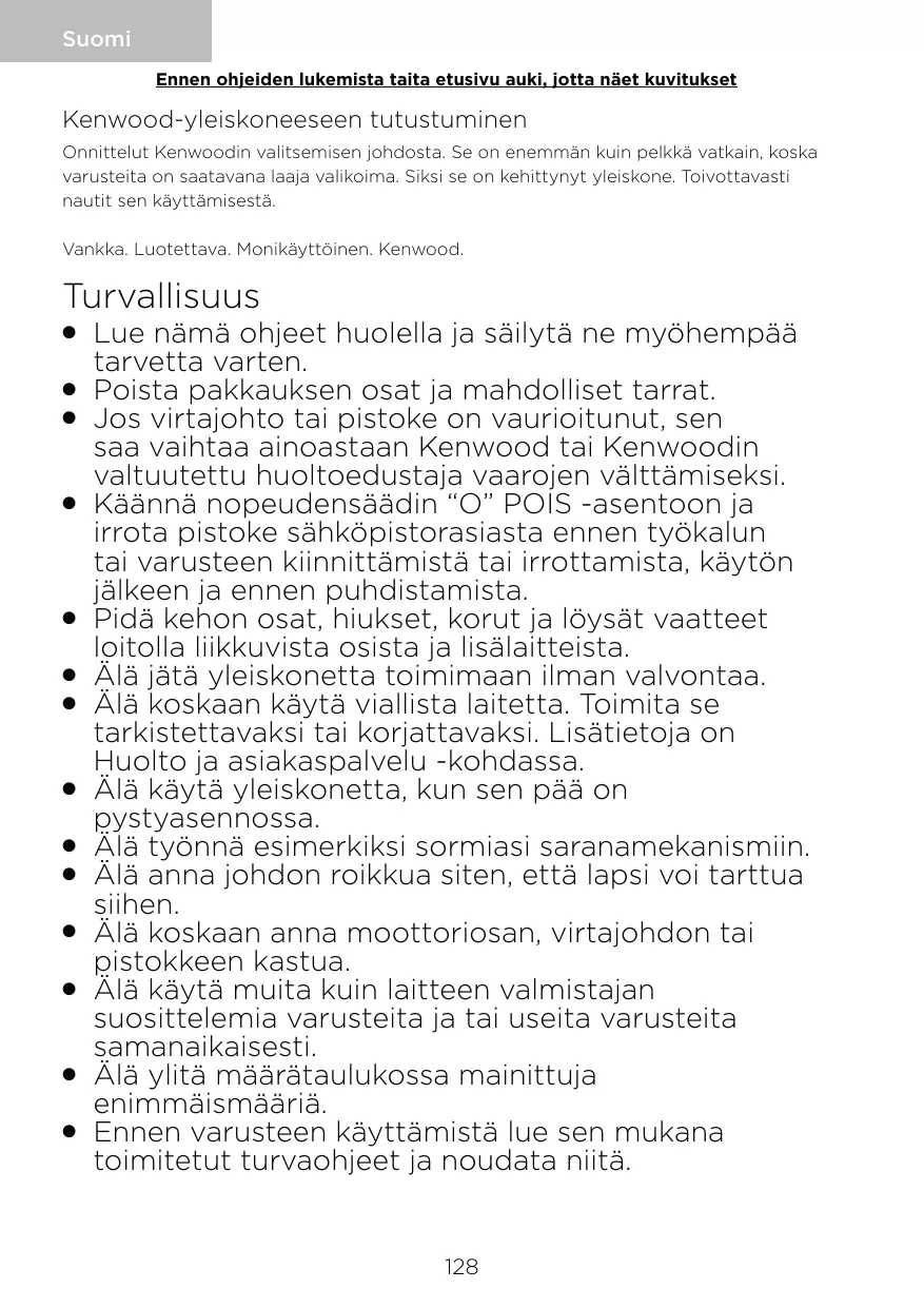 Lisez et conservez soigneusement ces instructions pour pouvoir vous y référer ultérieurement. O Retirez tous les éléments d’emballage et les étiquettes. O Si le cordon ou la prise sont endommagés, il faut les faire remplacer, pour des raisons de sécurité, par Kenwood ou un réparateur agréé par Kenwood pour éviter tout accident. O Mettez la commande de vitesse sur la position “ O “ OFF (Arrêt) et débranchez avant d’installer ou de retirer des ustensiles / accessoires, après utilisation et avant toute opération de nettoyage. O N’approchez pas des parties de votre corps, cheveux, bijoux ou vêtements amples des parties en mouvement et des accessoires installés. O Ne laissez jamais le robot pâtissier multifonction sans surveillance lorsqu’il fonctionne. O N’utilisez jamais un appareil endommagé. Faites-le vérifier ou réparer : reportez-vous à la rubrique “ Service après-vente “. O Ne faites jamais fonctionner votre robot pâtissier multifonction avec la tête en position levée. O Ne mettez pas les doigts dans le mécanisme de charnière. O Ne laissez jamais le cordon pendre de telle façon qu’un enfant puisse s’en saisir. O Veillez à ne jamais mouiller le bloc moteur, le cordon d’alimentation ou la prise. O N’utilisez jamais un accessoire non agréé ou plus d’un seul accessoire à la fois. O Ne dépassez jamais les quantités stipulées dans le tableau indiquant les quantités maximales. O