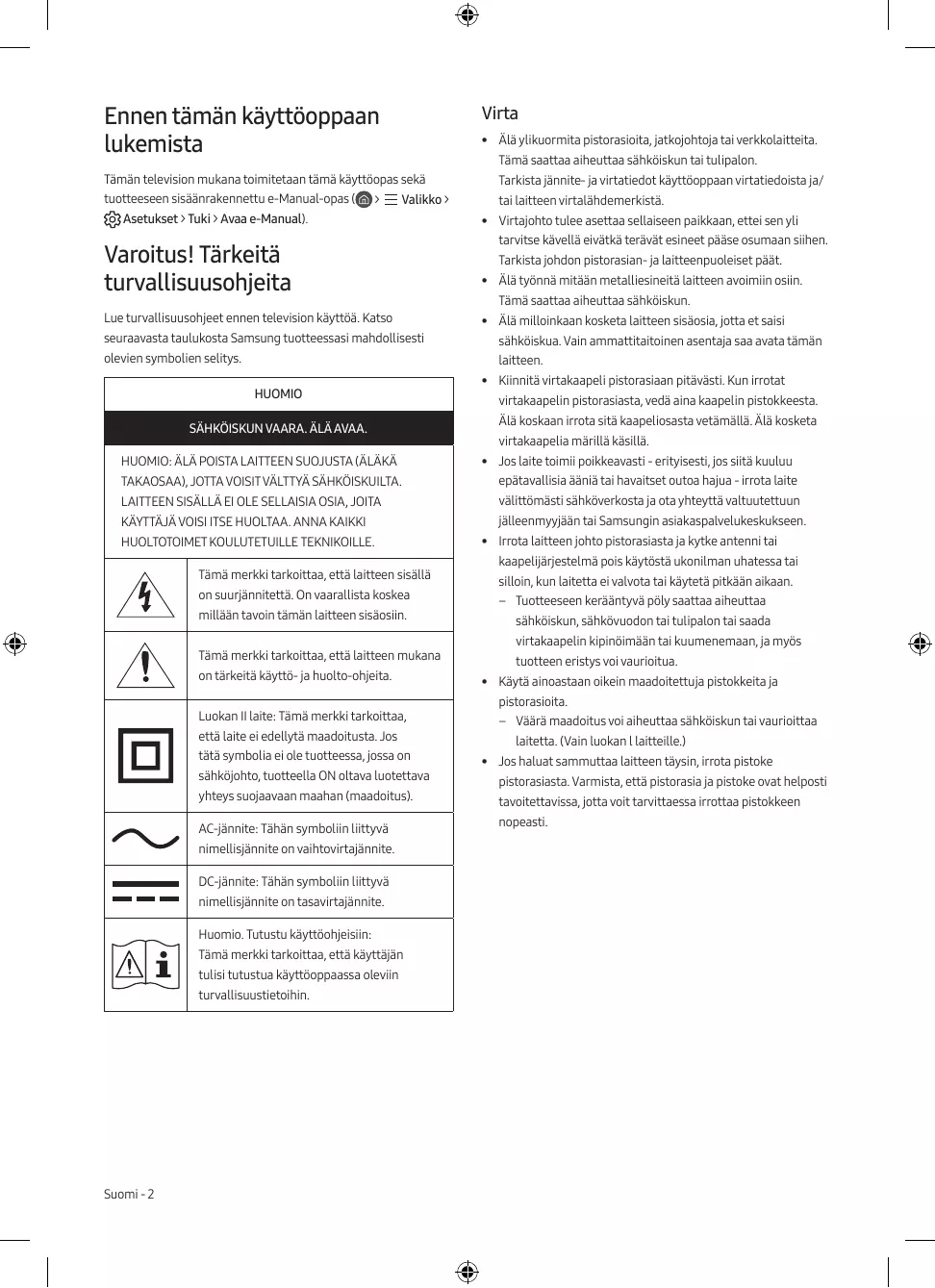 • • Älä ylikuormita pistorasioita, jatkojohtoja tai verkkolaitteita. Tämä saattaa aiheuttaa sähköiskun tai tulipalon. Tämän television mukana toimitetaan tämä käyttöopas sekä tuotteeseen sisäänrakennettu e-Manual-opas (