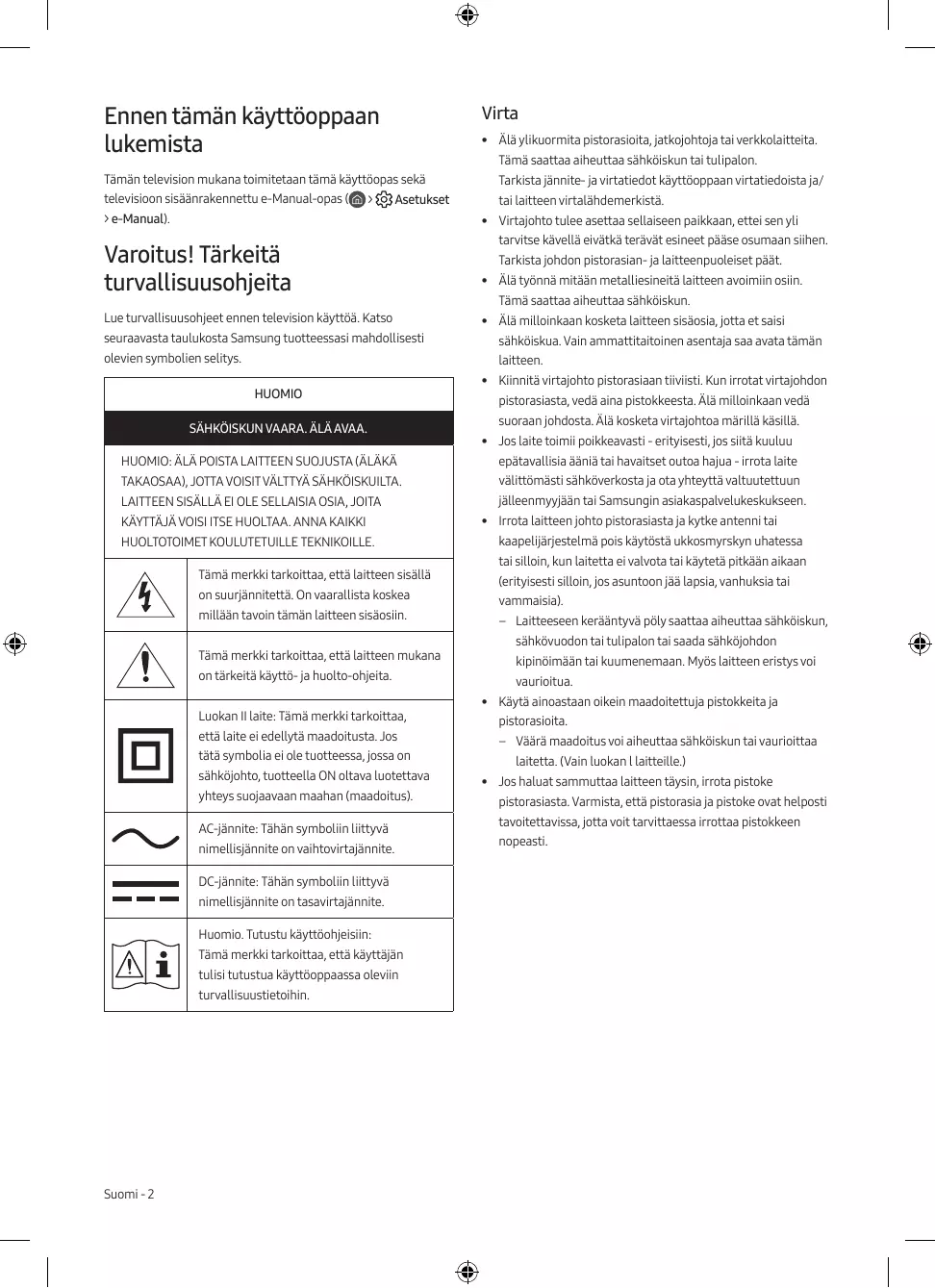 - • Älä ylikuormita pistorasioita, jatkojohtoja tai verkkolaitteita. Tämä saattaa aiheuttaa sähköiskun tai tulipalon. Tämän television mukana toimitetaan tämä käyttöopas sekä televisioon sisäänrakennettu e-Manual-opas (