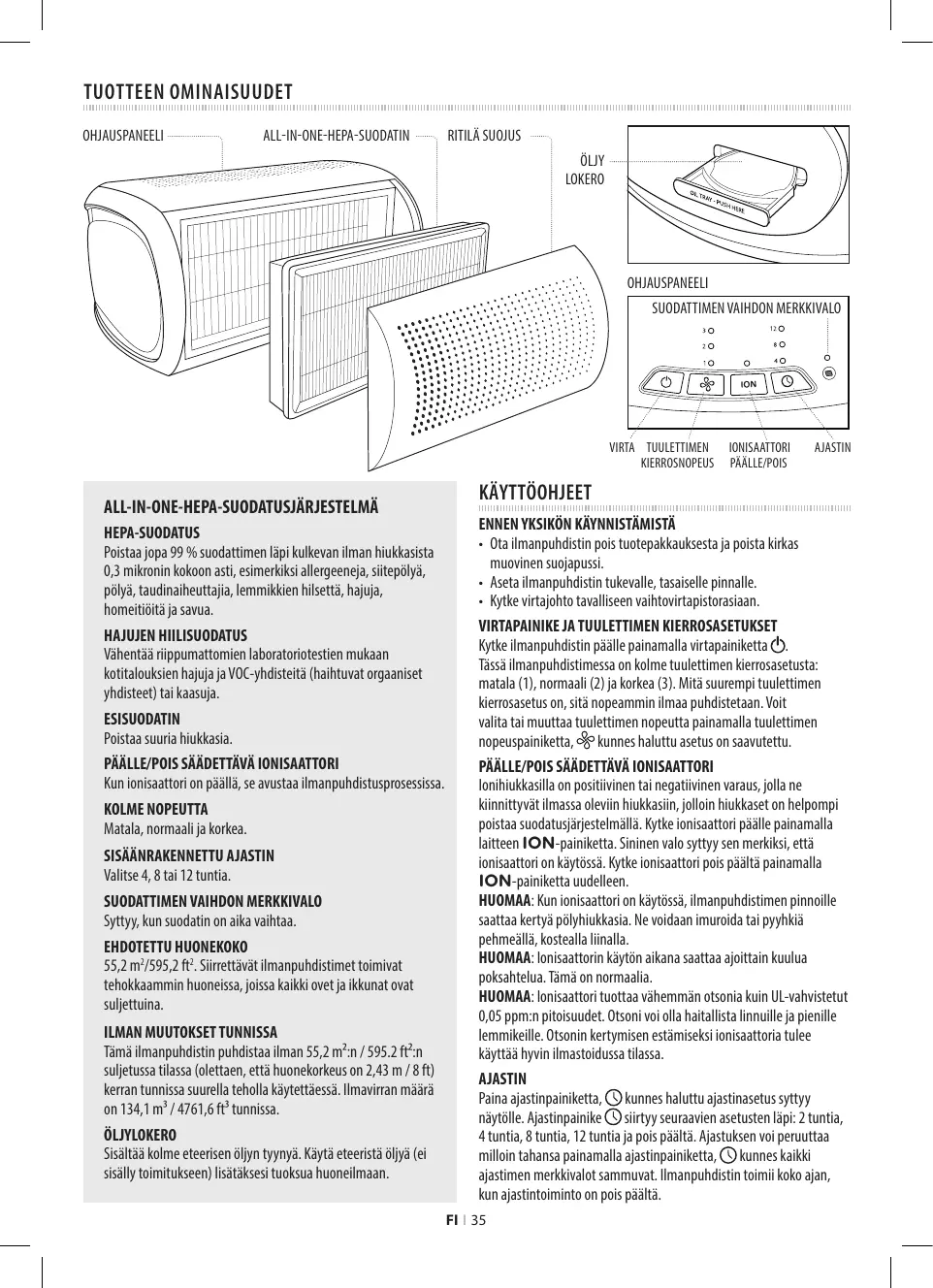34 I NO TUOTTEEN OMINAISUUDET OHJAUSPANEELI ALL-IN-ONE-HEPA-SUODATIN RITILÄ SUOJUS