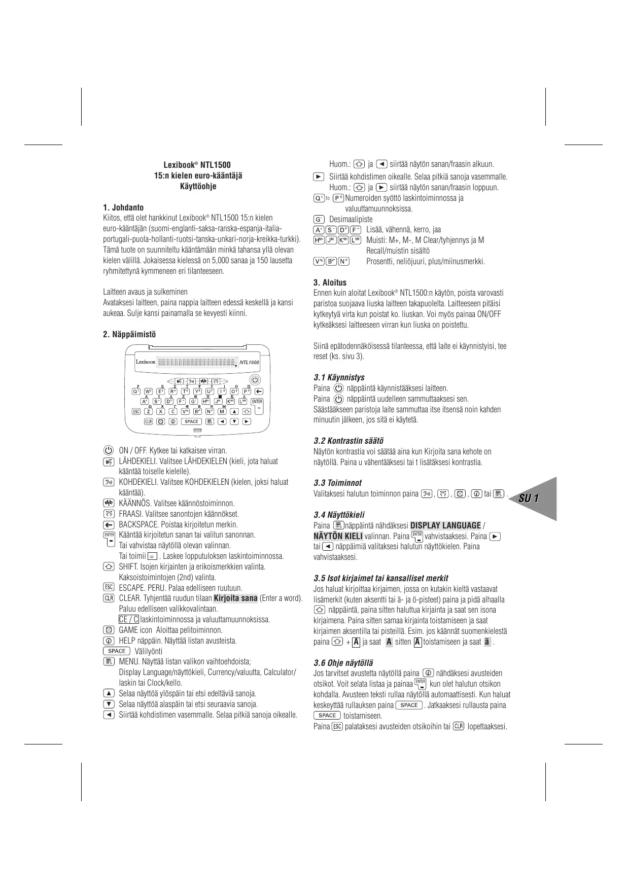 Lexibook® NTL1500 15:n kielen euro-kääntäjä Käyttöohje 1. Johdanto Kiitos, että olet hankkinut Lexibook® NTL1500 15:n kielen euro-kääntäjän (suomi-englanti-saksa-ranska-espanja-italiaportugali-puola-hollanti-ruotsi-tanska-unkari-norja-kreikka-turkki). Tämä tuote on suunniteltu kääntämään minkä tahansa yllä olevan kielen välillä. Jokaisessa kielessä on 5,000 sanaa ja 150 lausetta ryhmitettynä kymmeneen eri tilanteeseen. Laitteen avaus ja sulkeminen Avataksesi laitteen, paina nappia laitteen edessä keskellä ja kansi aukeaa. Sulje kansi painamalla se kevyesti kiinni. 2. Näppäimistö