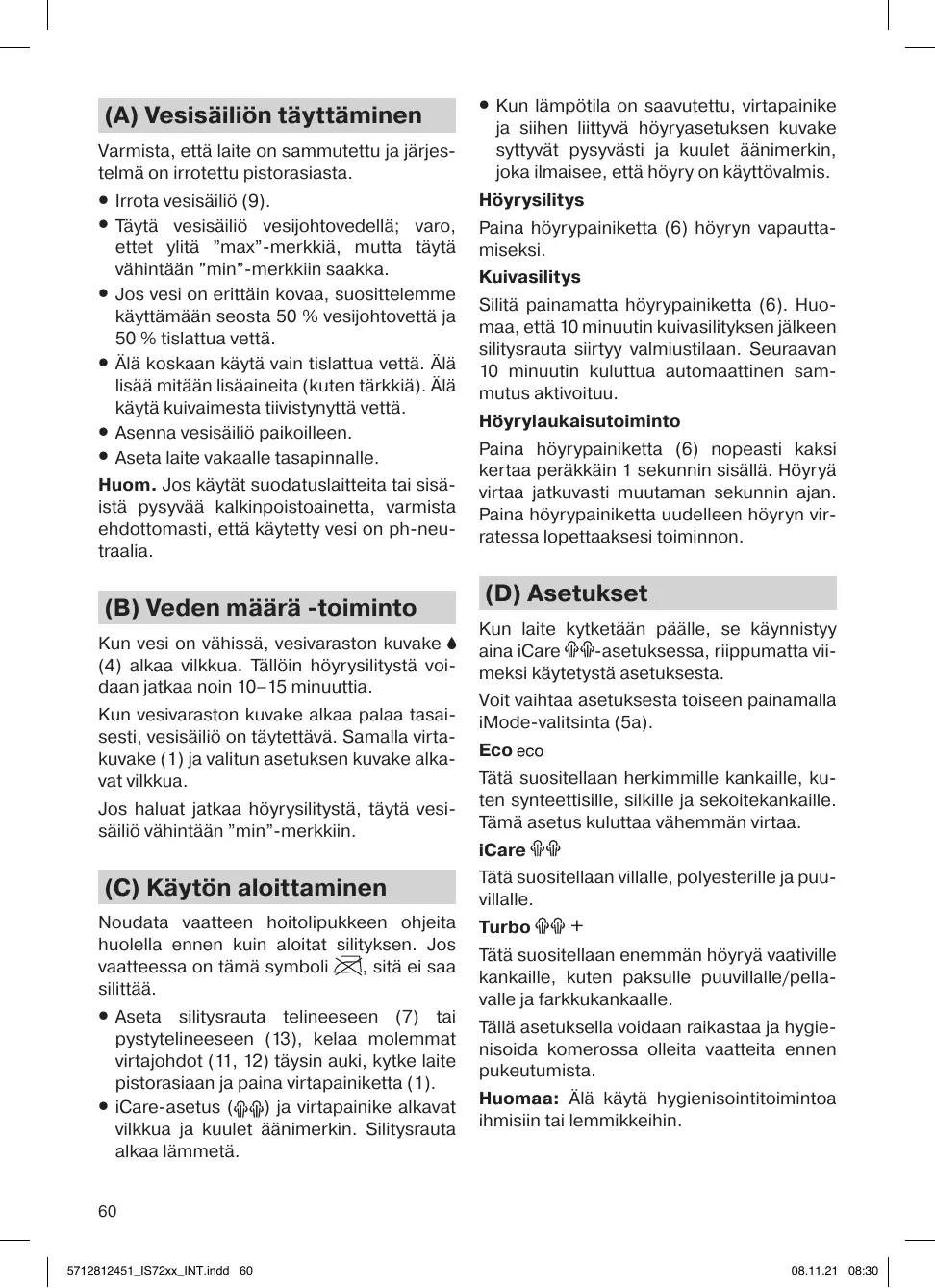 (D) Asetukset Kun laite kytketään päälle, se käynnistyy aina iCare -asetuksessa, riippumatta viimeksi käytetystä asetuksesta. Voit vaihtaa asetuksesta toiseen painamalla iMode-valitsinta (5a). Eco Tätä suositellaan herkimmille kankaille, kuten synteettisille, silkille ja sekoitekankaille. Tämä asetus kuluttaa vähemmän virtaa. iCare Tätä suositellaan villalle, polyesterille ja puuvillalle. Turbo Tätä suositellaan enemmän höyryä vaativille kankaille, kuten paksulle puuvillalle/pellavalle ja farkkukankaalle. Tällä asetuksella voidaan raikastaa ja hygienisoida komerossa olleita vaatteita ennen pukeutumista. Huomaa: Älä käytä hygienisointitoimintoa ihmisiin tai lemmikkeihin.