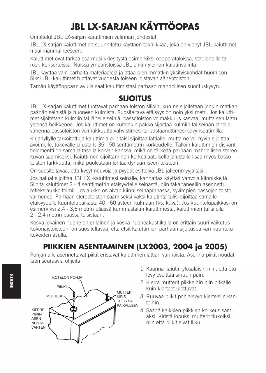 Los altavoces de la serie LX de JBL han sido diseñados utilizando la tecnología que ha hecho de JBL la marca de altavoces más famosa del mundo. Allá donde los altavoces sean una parte integral importante de las representaciones musicales, como son teatros de ópera, estadios de fútbol o conciertos de rock, JBL es la marca de altavoces preferida. Gracias a que únicamente se utilizan los mejores materiales disponibles y a que se presta el mayor cuidado en todos los detalles, JBL tiene la certeza de que sus altavoces le ofrecerán largos años de excelente rendimiento. Las instrucciones de este manual le ayudarán a extraer todo el potencial de que disponen sus altavoces.