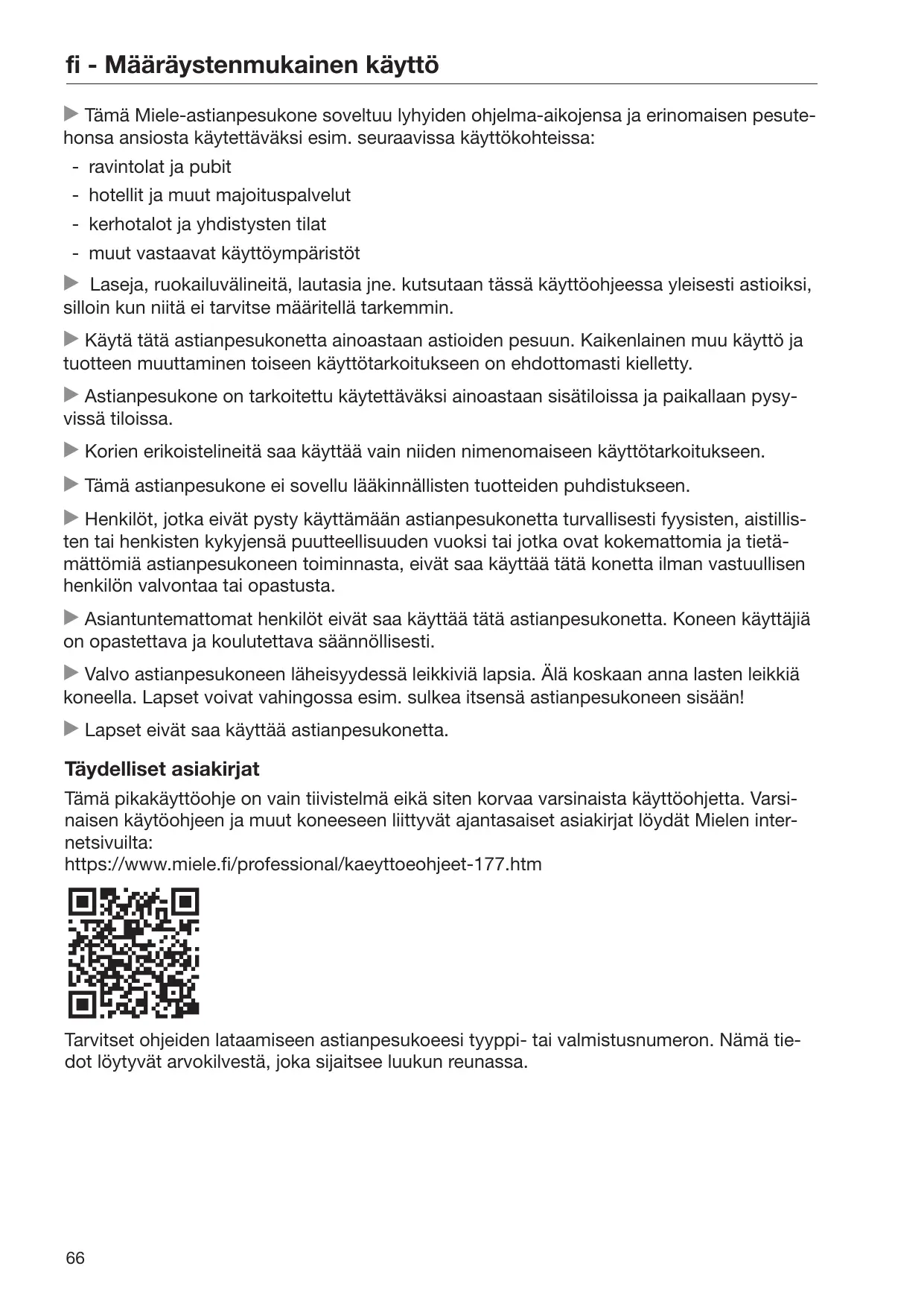 Téléchargez la notice de votre Astianpesukoneet au format PDF gratuitement ! Retrouvez votre notice PFD401LW - MIELE et reprennez votre appareil électronique en main. Sur cette page sont publiés tous les documents nécessaires à l'utilisation de votre appareil PFD401LW de la marque MIELE.