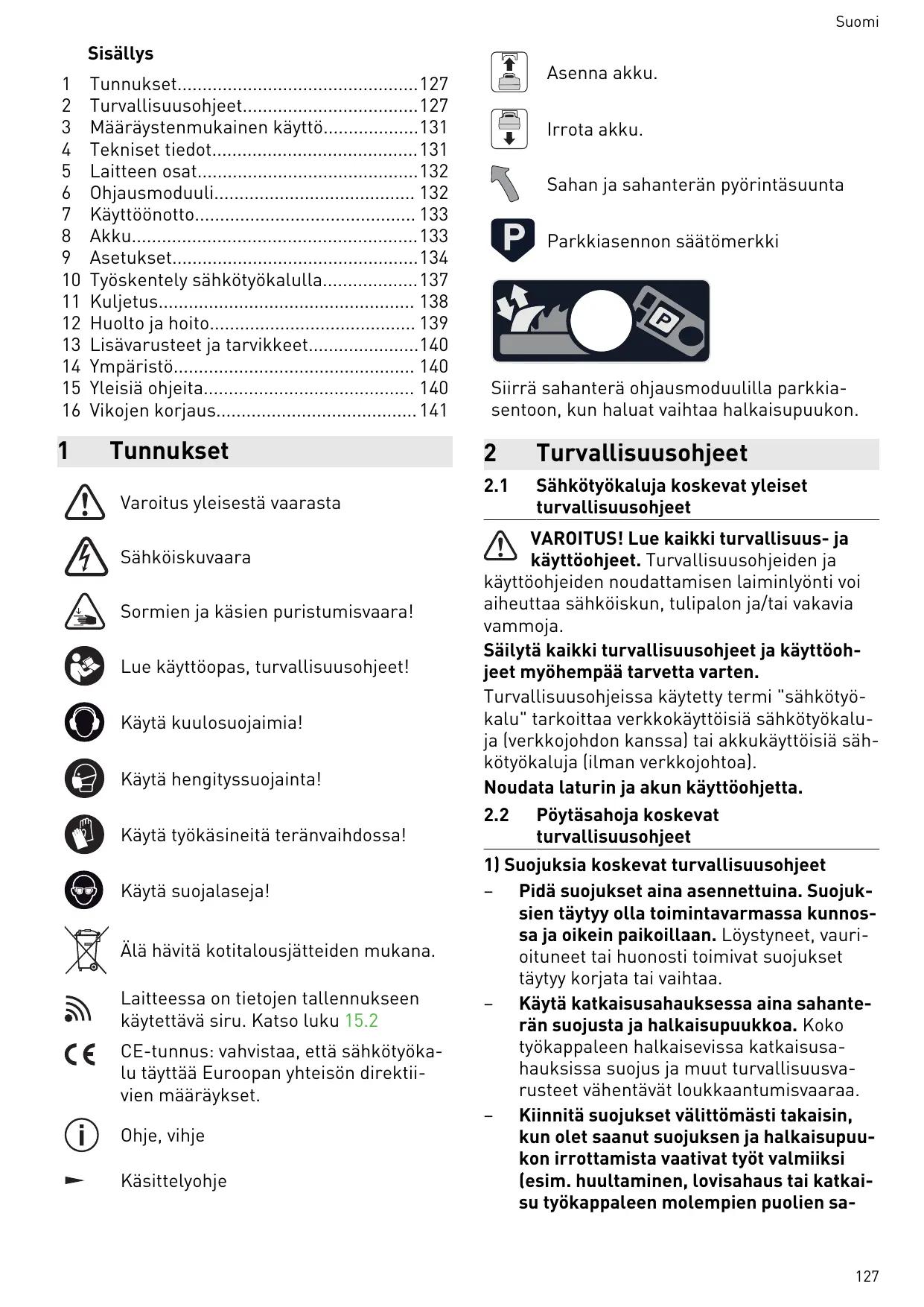 EN 303 446-1 V1.2.1 EN 301 489-1 V2.2.3, EN 301 489-17 V3.2.4 BS EN IEC 63000:2018 UK Approved Body for UK Type-examination: Technology International (Europe) Ltd. Unit 56, Shrivenham Hundred Business Park Lire le mode d'emploi et les consignes de sécurité ! Porter une protection auditive ! Porter une protection respiratoire ! Porter des gants de protection pour procéder au changement d'outil ! Porter des lunettes de protection ! Ne pas jeter avec les ordures ménagè res. L'outil contient une puce permettant l'enregistrement des données. Voir chapitre 15.2 Marquage CE : confirme la conformité de l'outil électroportatif aux directives de la Communauté européenne. Conseil, information Instruction