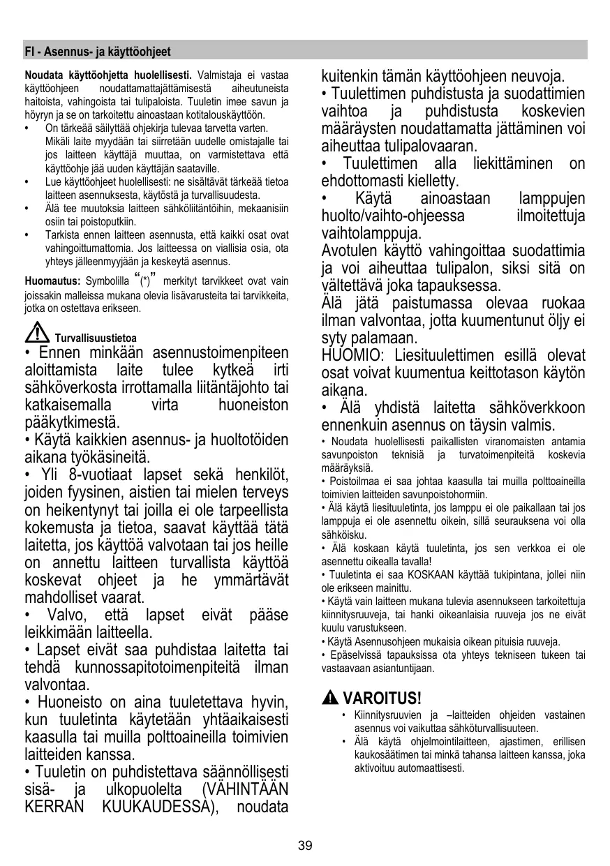 • Il est important de conserver ce livret pour pouvoir le consulter à tout moment. En cas de vente, de cession ou de déménagement, assurez-vous que la notice d'utilisation l'accompagne. • Veuillez lire attentivement les instructions, vous trouverez des informations importantes sur l'installation, le mode d'emploi et la sécurité. • Ne pas effectuer des modifications électriques ou mécaniques sur le produit ou sur les conduits d’évacuation. • Avant d'installer l'appareil, vérifiez qu’il n’y a aucun composant endommagé. Sinon, contactez votre revendeur et ne continuez pas l'installation. Remarque : Les pièces portant le symbole "(*)" sont des accessoires optionnels fournis uniquement avec certains modèles ou des pièces non fournies, à acheter. Attention
