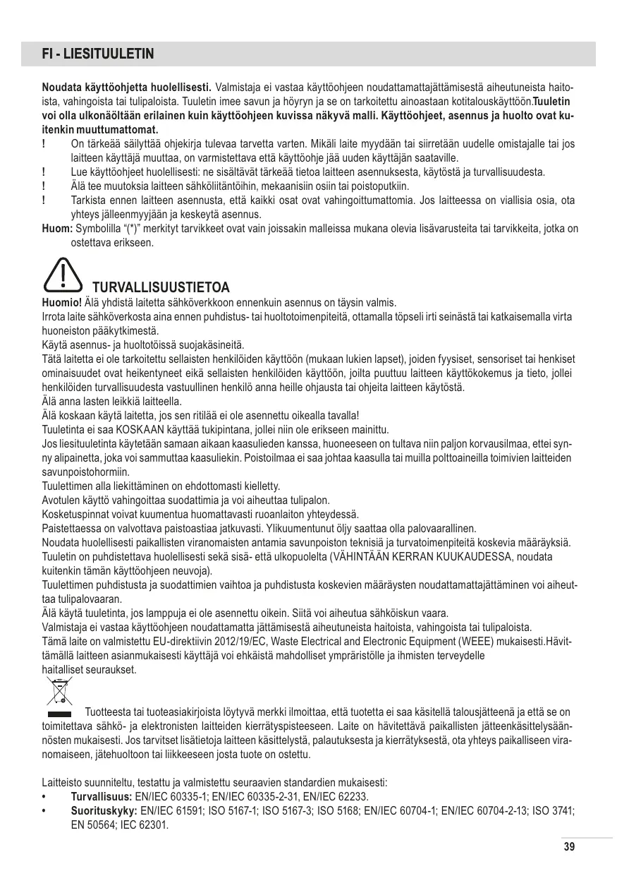 Tuotteesta tai tuoteasiakirjoista löytyvä merkki ilmoittaa, että tuotetta ei saa käsitellä talousjätteenä ja että se on toimitettava sähkö- ja elektronisten laitteiden kierrätyspisteeseen. Laite on hävitettävä paikallisten jätteenkäsittelysäännösten mukaisesti. Jos tarvitset lisätietoja laitteen käsittelystä, palautuksesta ja kierrätyksestä, ota yhteys paikalliseen viranomaiseen, jätehuoltoon tai liikkeeseen josta tuote on ostettu. Laitteisto suunniteltu, testattu ja valmistettu seuraavien standardien mukaisesti: • Turvallisuus: EN/IEC 60335-1; EN/IEC 60335-2-31, EN/IEC 62233. • Suorituskyky: EN/IEC 61591; ISO 5167-1; ISO 5167-3; ISO 5168; EN/IEC 60704-1; EN/IEC 60704-2-13; ISO 3741; EN 50564; IEC 62301. 39