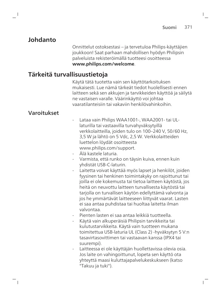 = Lataa vain Philips WAA1001-, WAA2001- tai UL- laturilla tai vastaavilla turvahyväksytyillà verkkolaitteilla, joiden tulo on 100-240 V, 50/60 Hz, 3,5 W ja lähtô on 5 Vdc, 2,5 W. Verkkolaitteiden luettelon lôydät osoitteesta www.philips.com/support