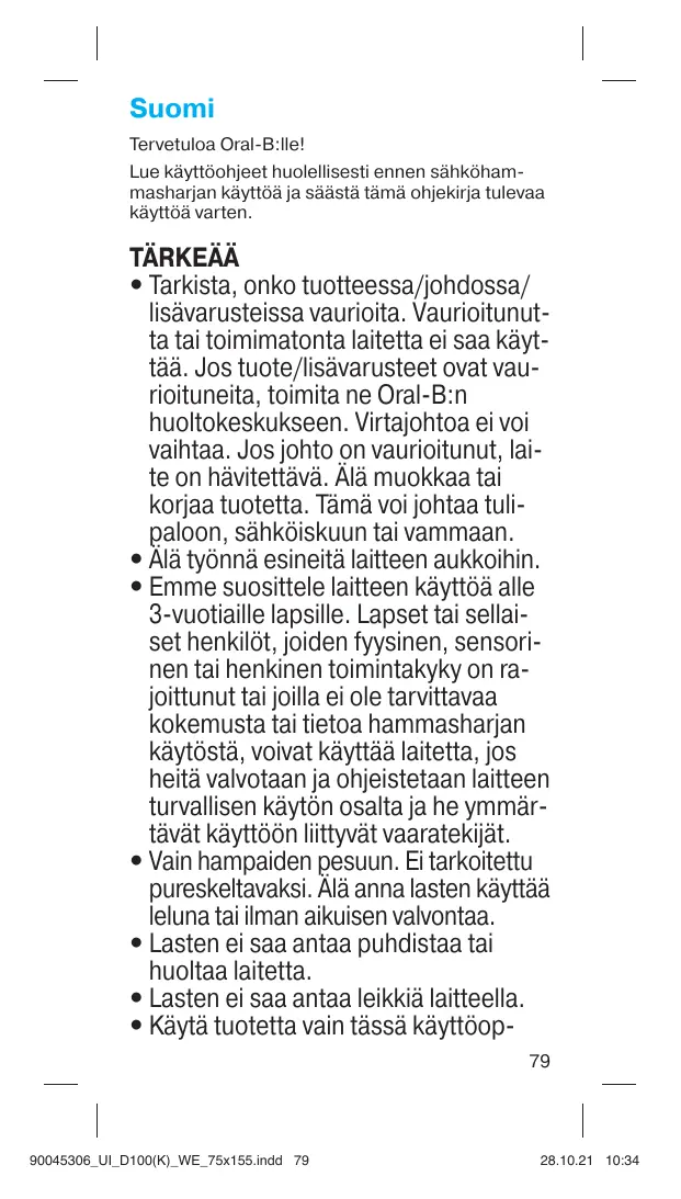 Téléchargez la notice de votre Sähköhammasharja au format PDF gratuitement ! Retrouvez votre notice Vitality 100cross - ORAL-B et reprennez votre appareil électronique en main. Sur cette page sont publiés tous les documents nécessaires à l'utilisation de votre appareil Vitality 100cross de la marque ORAL-B.