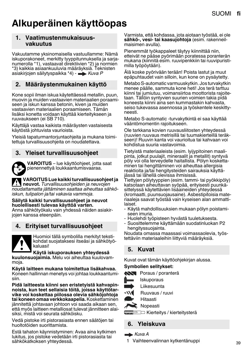 KÄYTTÖOHJE SB 710 SBE 701 SP SBE 710 SBE 730 SBE 751 SBE 850 SBE 900 Impuls SBE 1000 SBE 1100 Plus SBE 1300 METABO