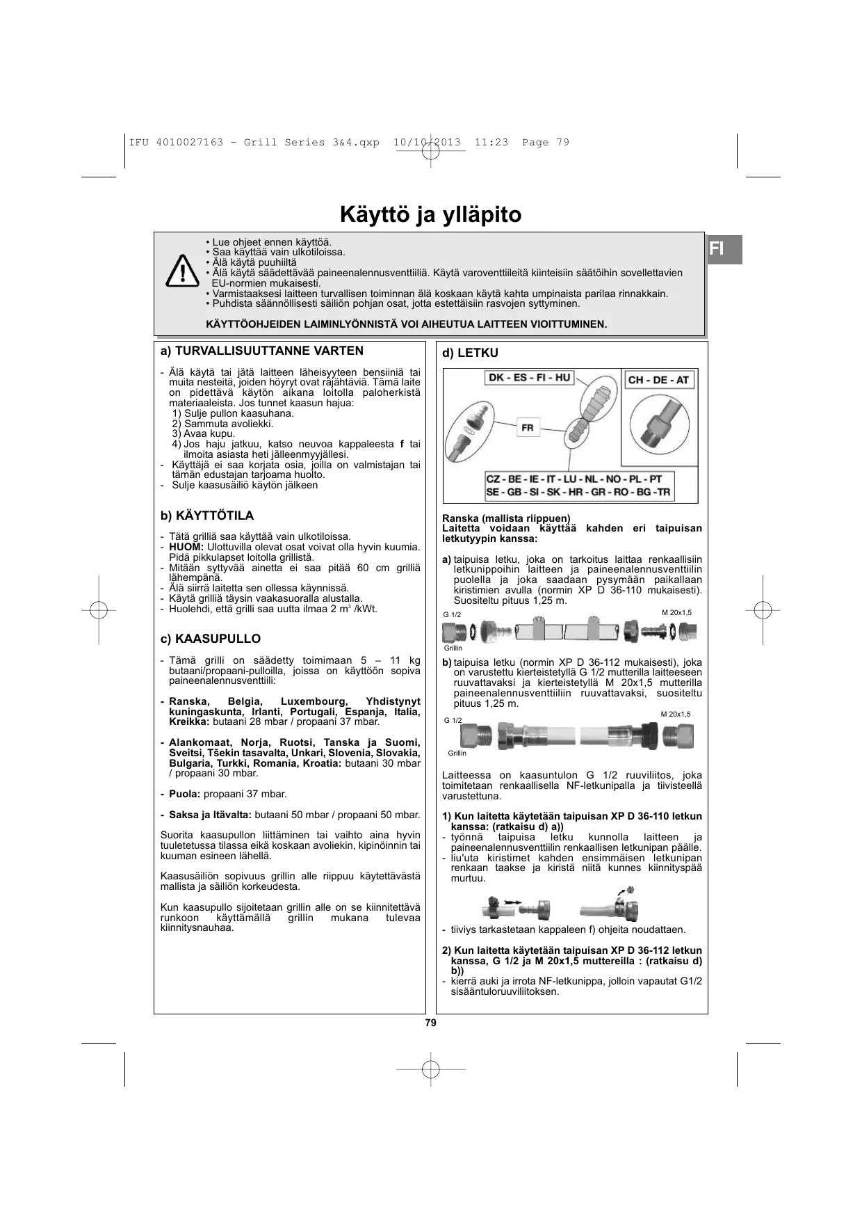 Alà sytytä griliä, ennen kuin olet lukenut tarkkaan ja ymmärtänyt kaikki ohjeet. Varmista lisäksi, että = vuotoja ei ole