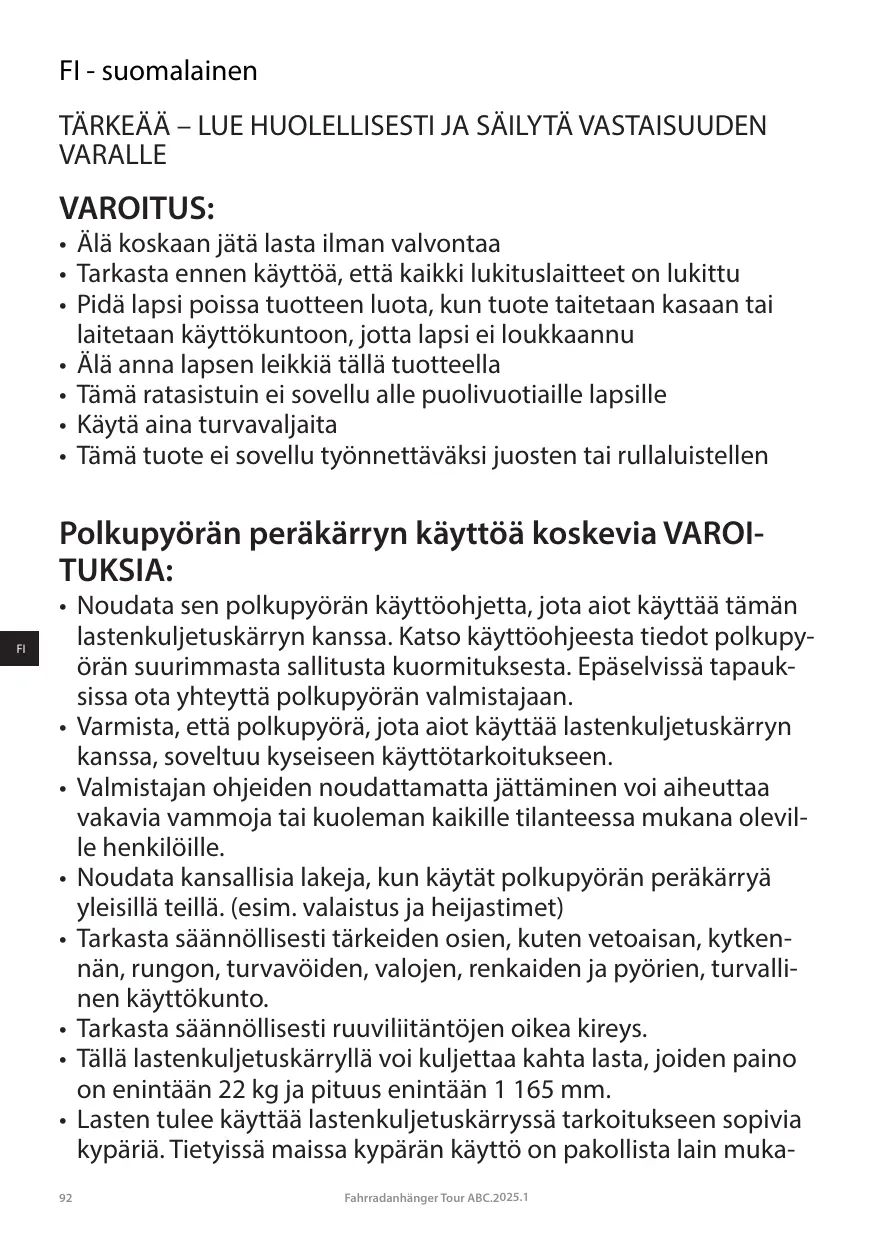 -+ Suivez les instructions d'utilisation du vélo avec lequel vous sou- haitez utiliser cette remorque pour enfants. Vous y trouverez des informations sur la charge maximale autorisée du vélo. En cas de doute, contactez le fabricant de votre vélo.