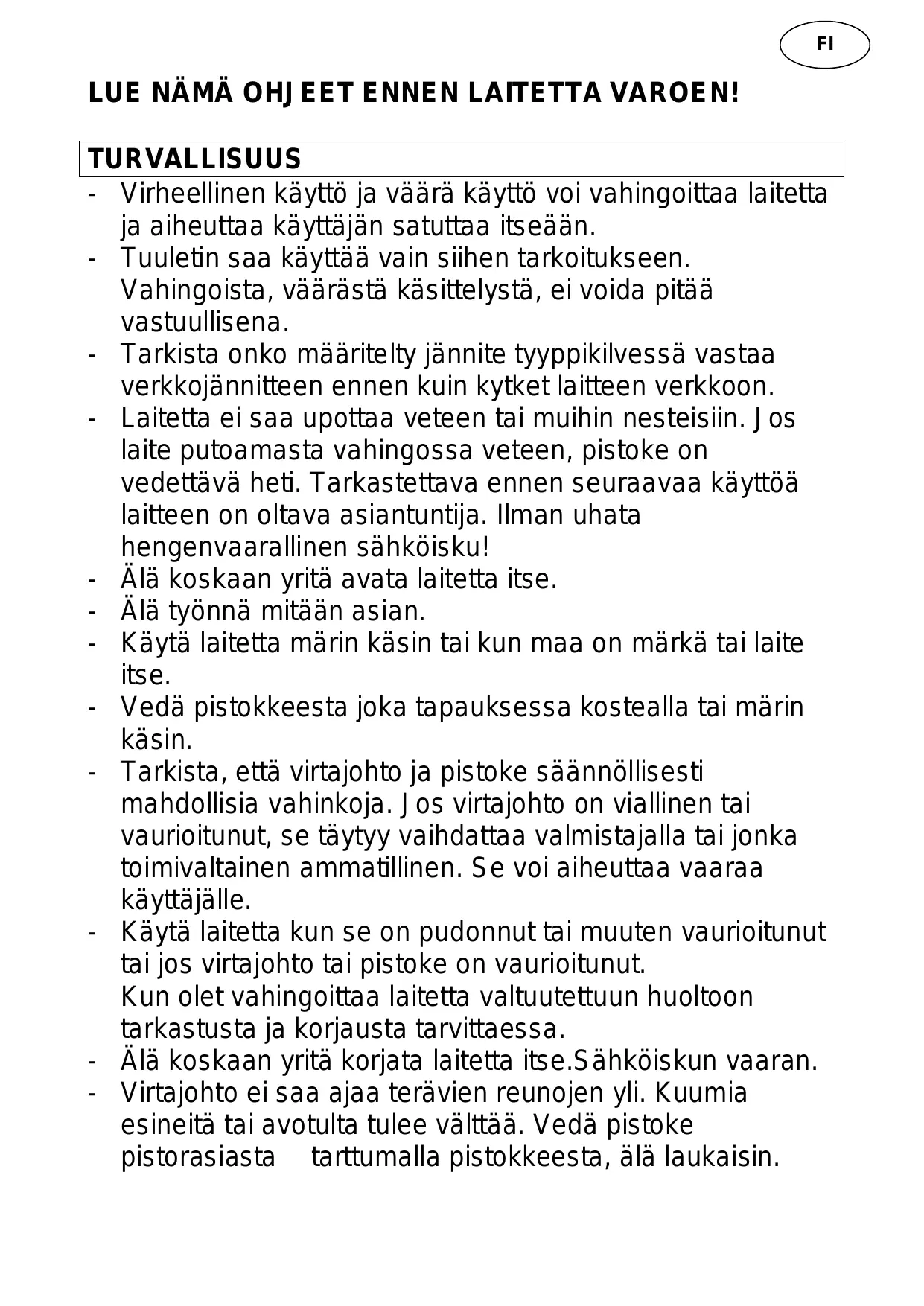 LUE NÂMÀ OHJ EET ENNEN LAITETTA VAROEN! TURVALLISUUS -_ Virheellinen käyttô ja vääré käyttô voi vahingoittaa laitetta ja aiheuttaa käyttéjän satuttaa itseään. - Tuuletin saa käyttäà vain sihen tarkoitukseen. Vahingoista, väärästé käsittelysté, ei voida pitää vastuullisena. -_ Tarkista onko määritelty jännite tyyppikilvessä vastaa verkkojännitteen ennen kuin kytket laitteen verkkoon. - Laitetta ei saa upottaa Veteen tai muihin nesteisiin. ] os laite putoamasta vahingossa veteen, pistoke on vedettävà heti. Tarkastettava ennen seuraavaa käyttoà laitteen on oltava asiantuntija. IIman uhata hengenvaarallinen sähküisku! -_ Àlà koskaan yrità avata laitetta itse. -_ Àlà tyônnä mitéän asian. - Käyté laitetta märin käsin tai kun maa on märkë tai laite itse. - Vedä pistokkeesta joka tapauksessa kostealla tai märin käsin. -_ Tarkista, ettà virtajohto ja pistoke säännüllisesti mahdollisia vahinkoja. | os virtajohto on viallinen tai vaurioitunut, se täytyy vaihdattaa valmistajalla tai jonka toimivaltainen ammatillinen. Se voi aiheuttaa vaaraa käyttäjälle. -_ Käyté laitetta kun se on pudonnut tai muuten vaurioitunut tai jos virtajohto tai pistoke on vaurioitunut. Kun olet vahingoittaa laitetta valtuutettuun huoltoon tarkastusta ja korjausta tarvittaessa. -_ Àlà koskaan yrità korjata laitetta itse.S ähkôiskun vaaran. - Virtajohto ei saa ajaa terävien reunojen yli. Kuumia esineità tai avotulta tulee välttää. Vedä pistoke pistorasiasta tarttumalla pistokkeesta, älé laukaisin.