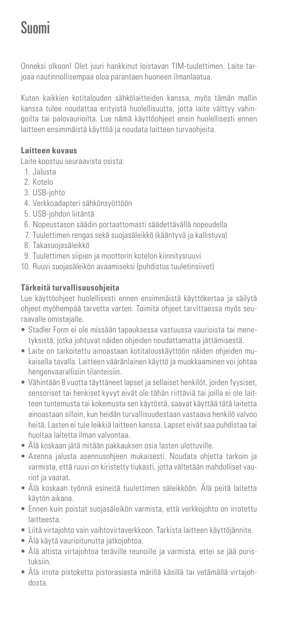 Suomi Onneksi olkoon! Olet juuri hankkinut loistavan TIM-tuulettimen. Late tar- joaa nautinnollisempaa oloa parantaen huoneen ilmanlaatua. Kuten kaïkkien kotitalouden sähkëlaitteiden kanssa, myës tämän malin kanssa tulee noudattaa erityistä huolellisuutta, jotta laite välttyy vahin- goilta tai palovaurioilta. Lue nämä käyttéohjeet ensin huolellisesti ennen laitteen ensimmäistä käyttôà ja noudata laitteen turvaohjeita Laitteen kuvaus Laite koostuu seuraavista osista: