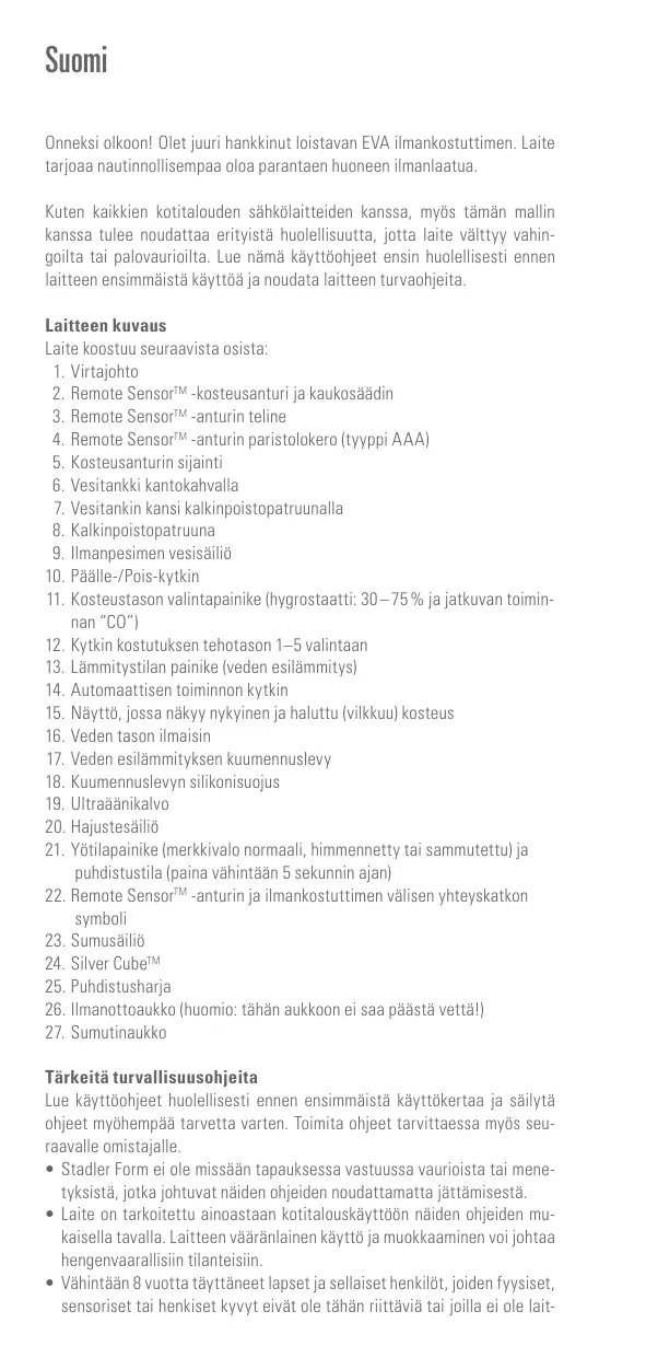 Suomi Onneksi olkoon! Olet juuri hankkinut loistavan EVA imankostuttimen. Laite tarjoaa nautinnollisempaa oloa parantaen huoneen imanlaatua Kuten kaïkkien kotitalouden sähkëlaitteiden kanssa, myës tämän malin kanssa tulee noudattaa erityistä huolellisuutta, jotta laite välttyy vahin- goilta tai palovaurioilta. Lue nämä käyttéohjeet ensin huolellisesti ennen laitteen ensimmäistä käyttôà ja noudata laitteen turvaohjeita Laitteen kuvaus Laite koostuu seuraavista osista
