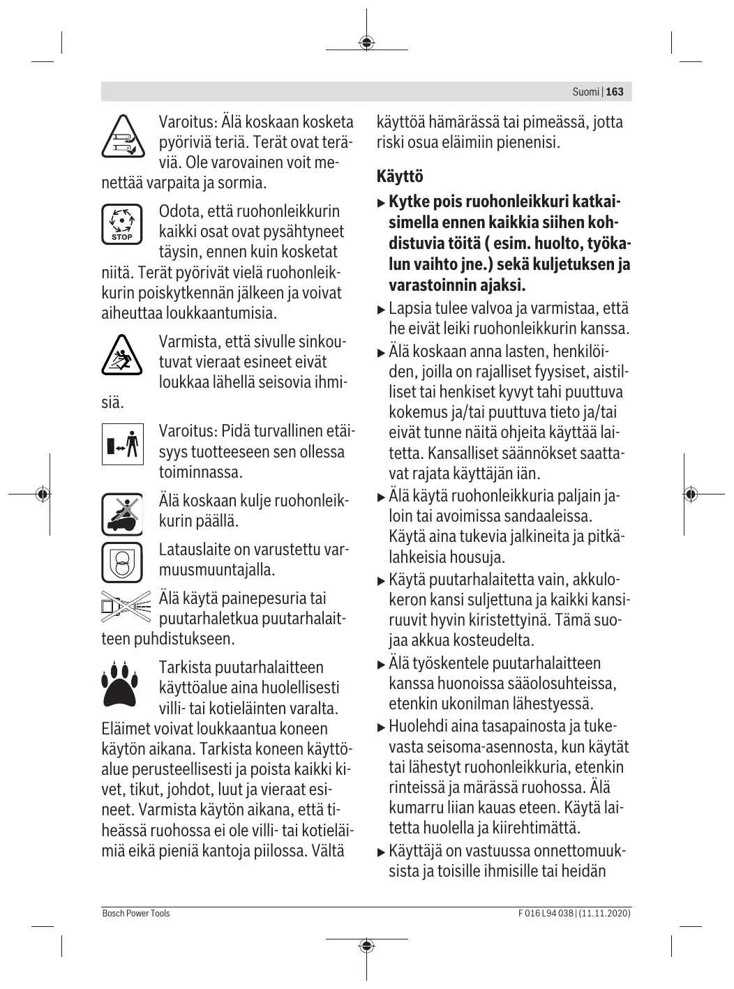 bruiken zorgvuldig op in het wild levende dieren en huisdieren. In het wild levende dieren en huisdieren kunnen tijdens het gebruik van de ma- chine gewond raken. Controleer het gedeelte waar u de machine wilt ge- bruiken grondig en verwijder alle ste- nen, stokken, draden, botten en ande- re voorwerpen. Let er bij het gebruik van de machine op dat er geen in het wild levende dieren, huisdieren of klei- ne boomstronken in dicht gras verbor- gen zijn. Vermijd gebruik in de sche- mering of in het donker om het risico van het tegenkomen van dieren te ver- minderen.